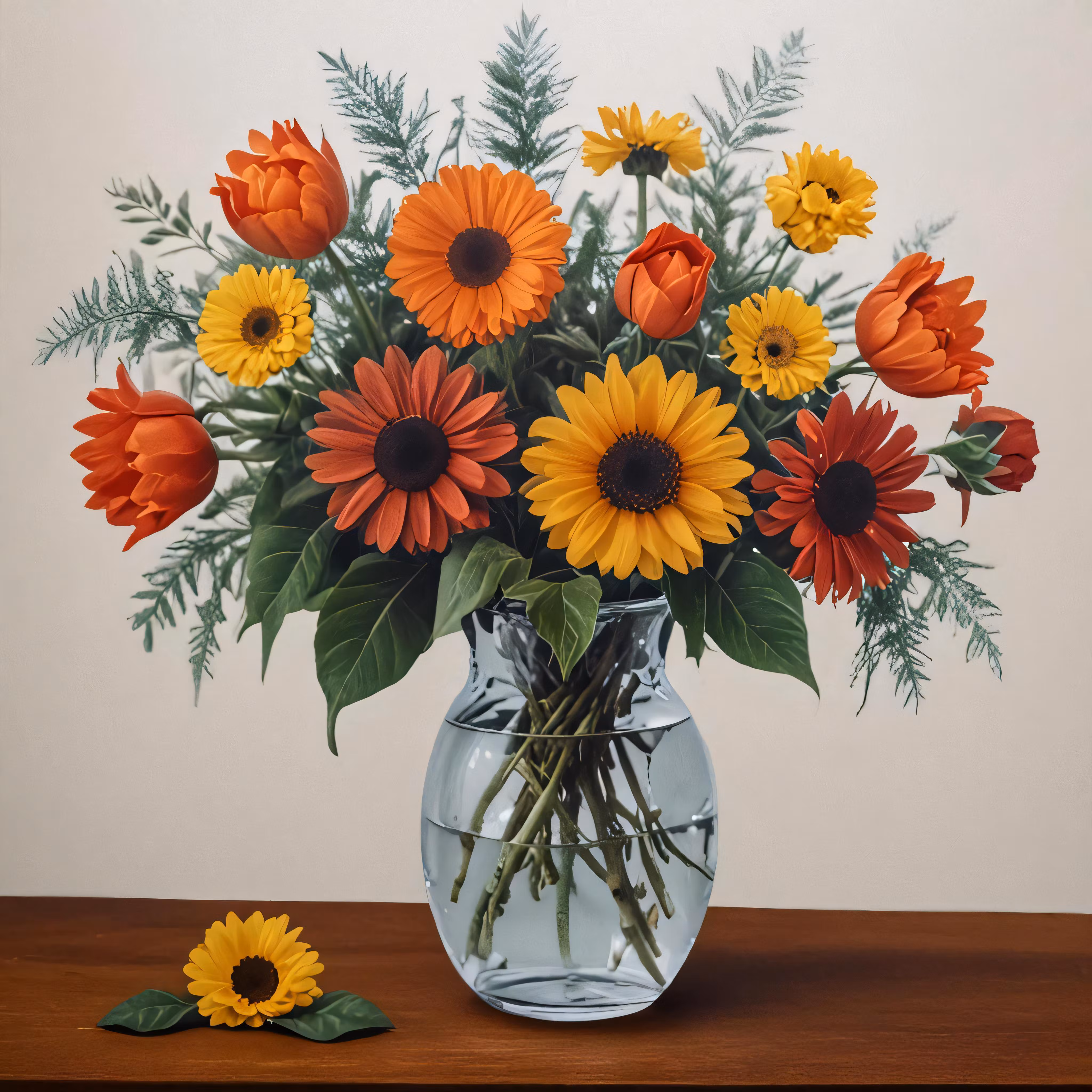 High resolution picture, free to use, a glass vase full of yellow, orange and red flowers