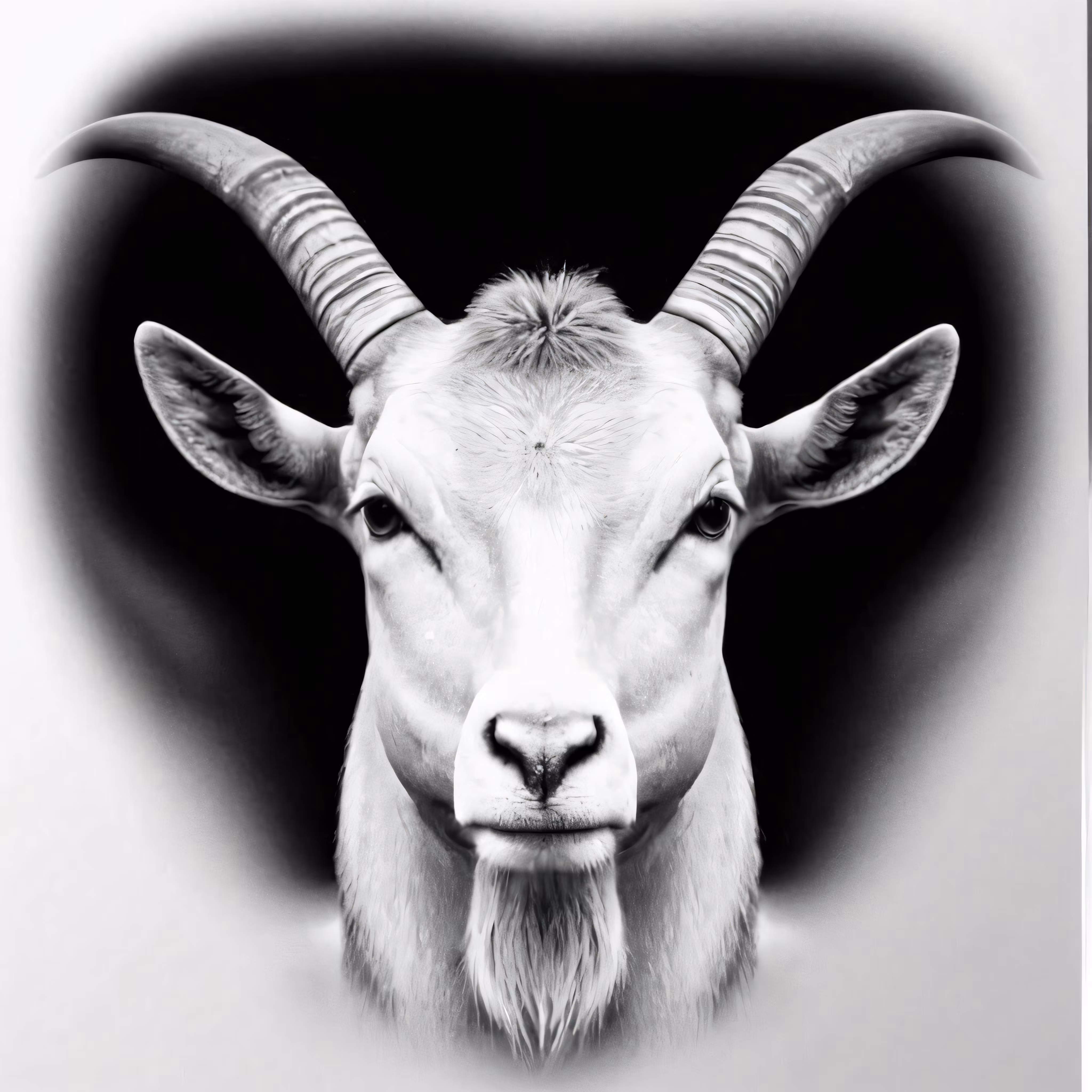 High resolution picture, free to use, a goat with long horns standing in front of a mirror
