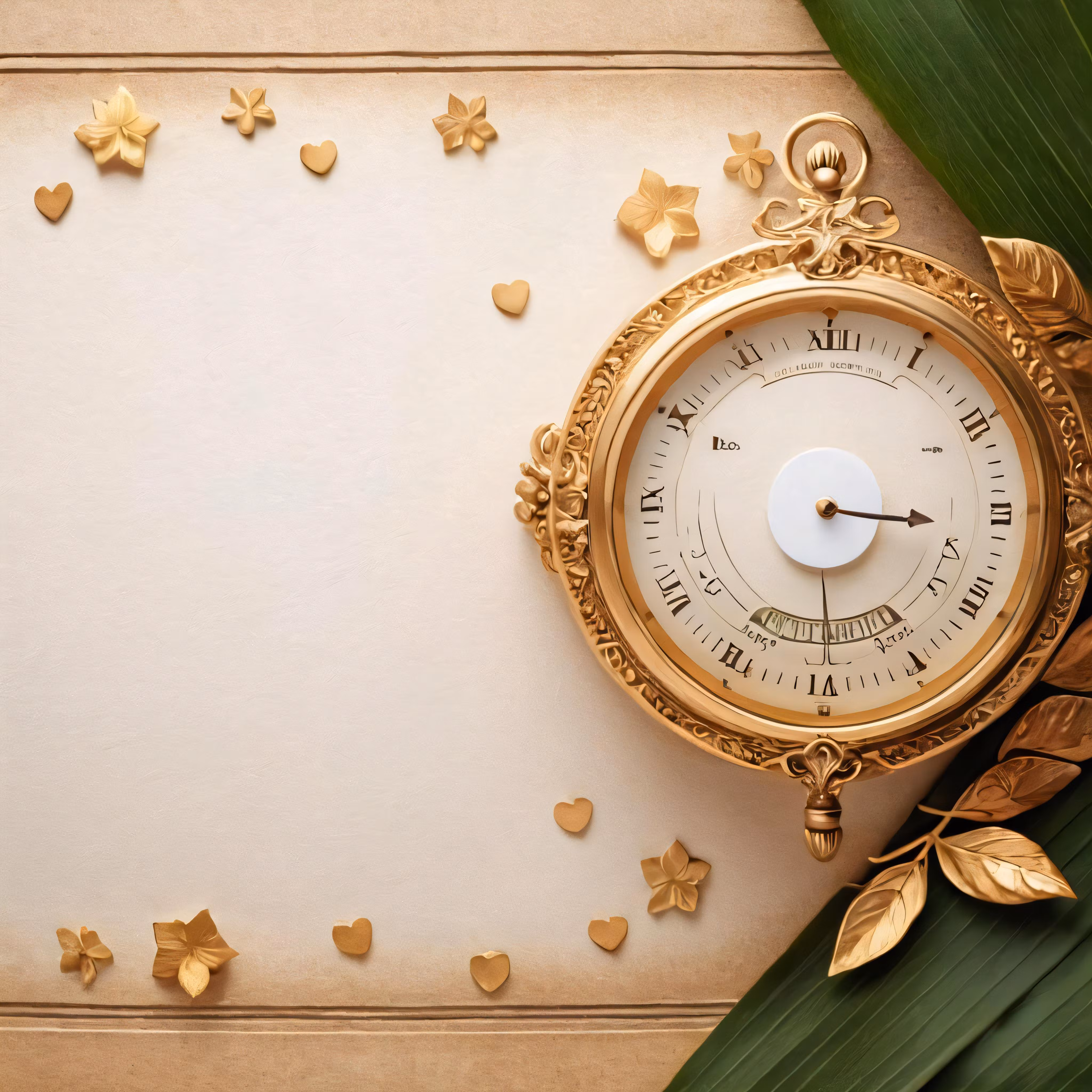 High resolution picture, free to use, a gold clock surrounded by heart shaped gold leaves
