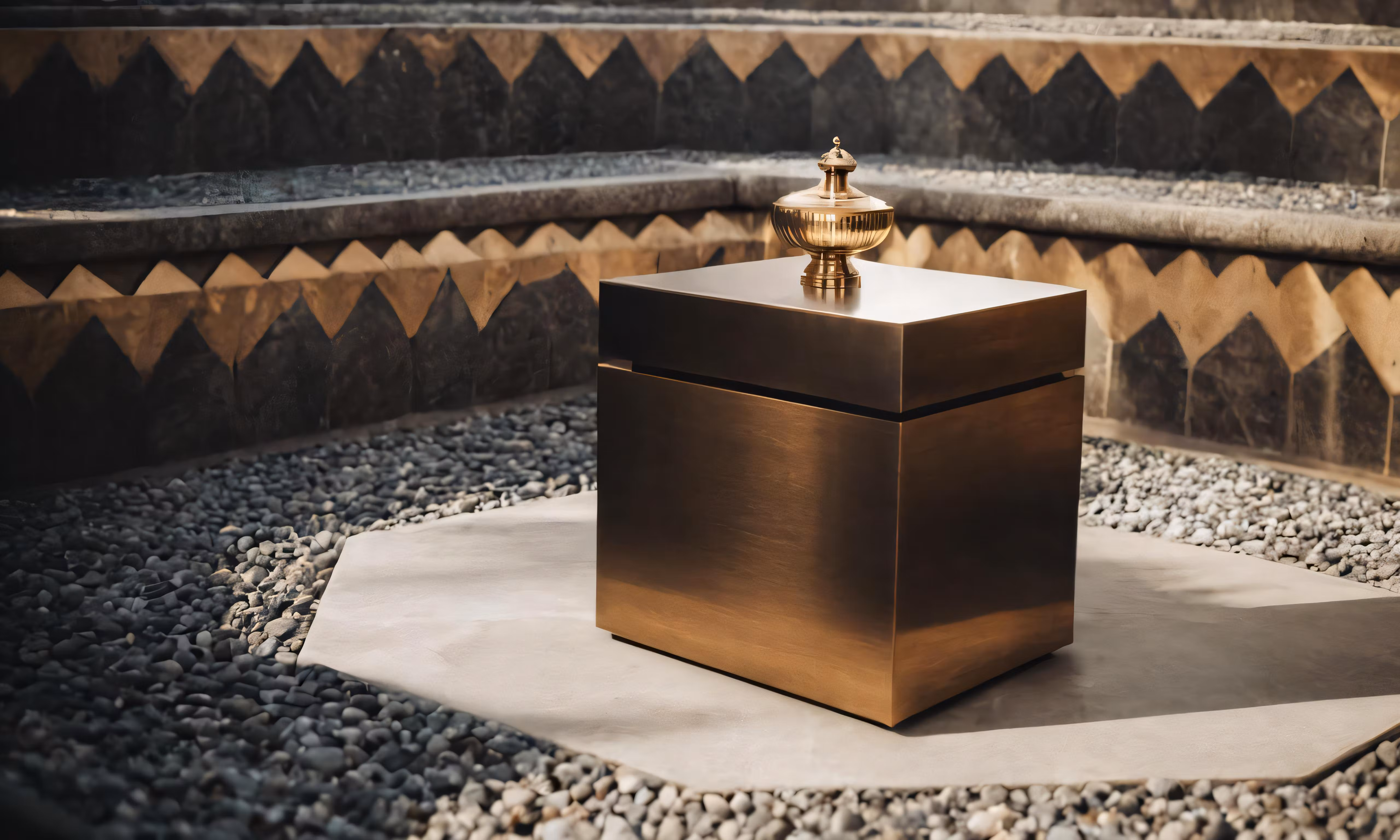 High resolution picture, free to use, a golden vase sitting on top of a table next to a staircase
