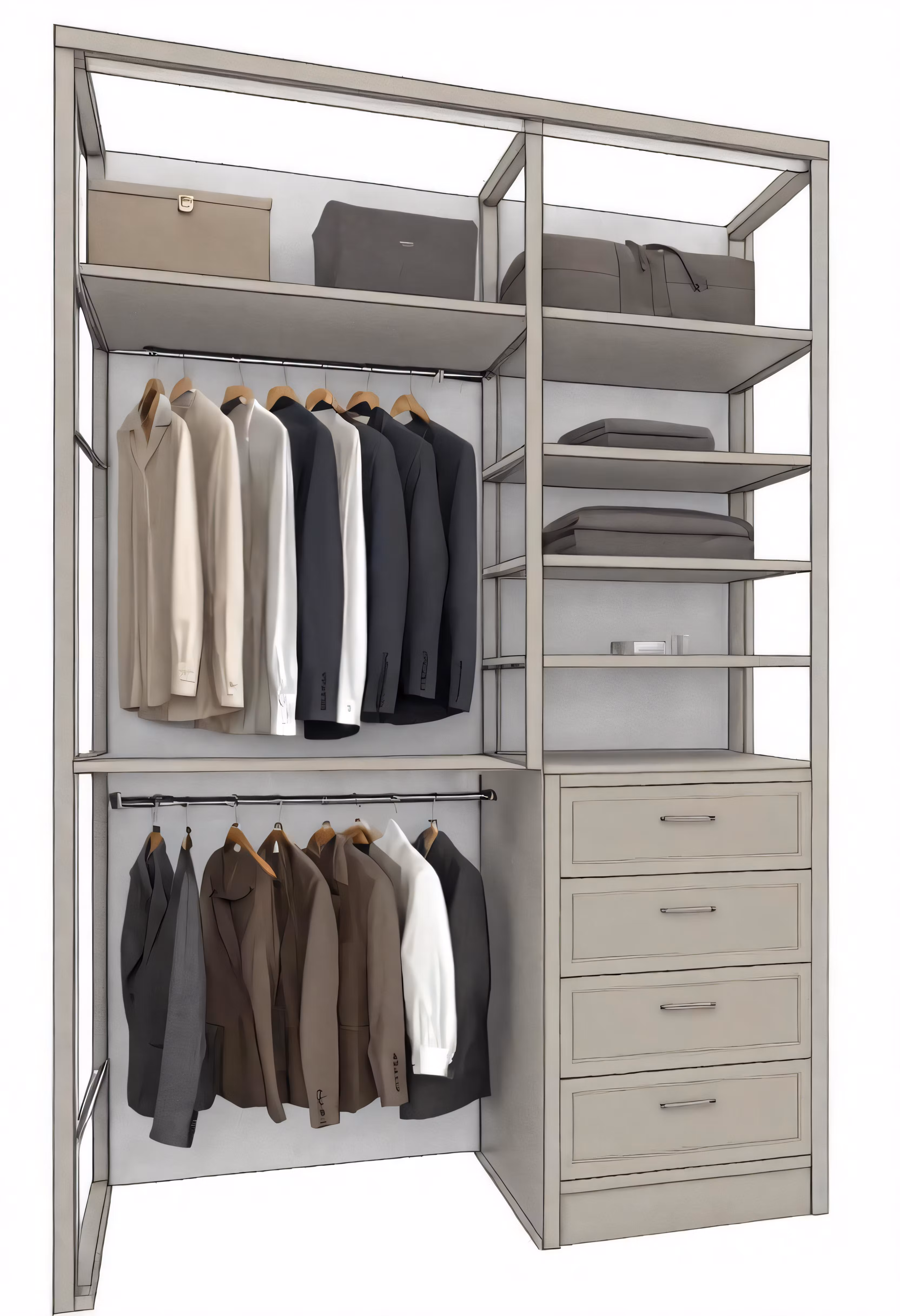 High resolution picture, free to use, a gray and white closet with shelves, cabinets, and shirts on hangers
