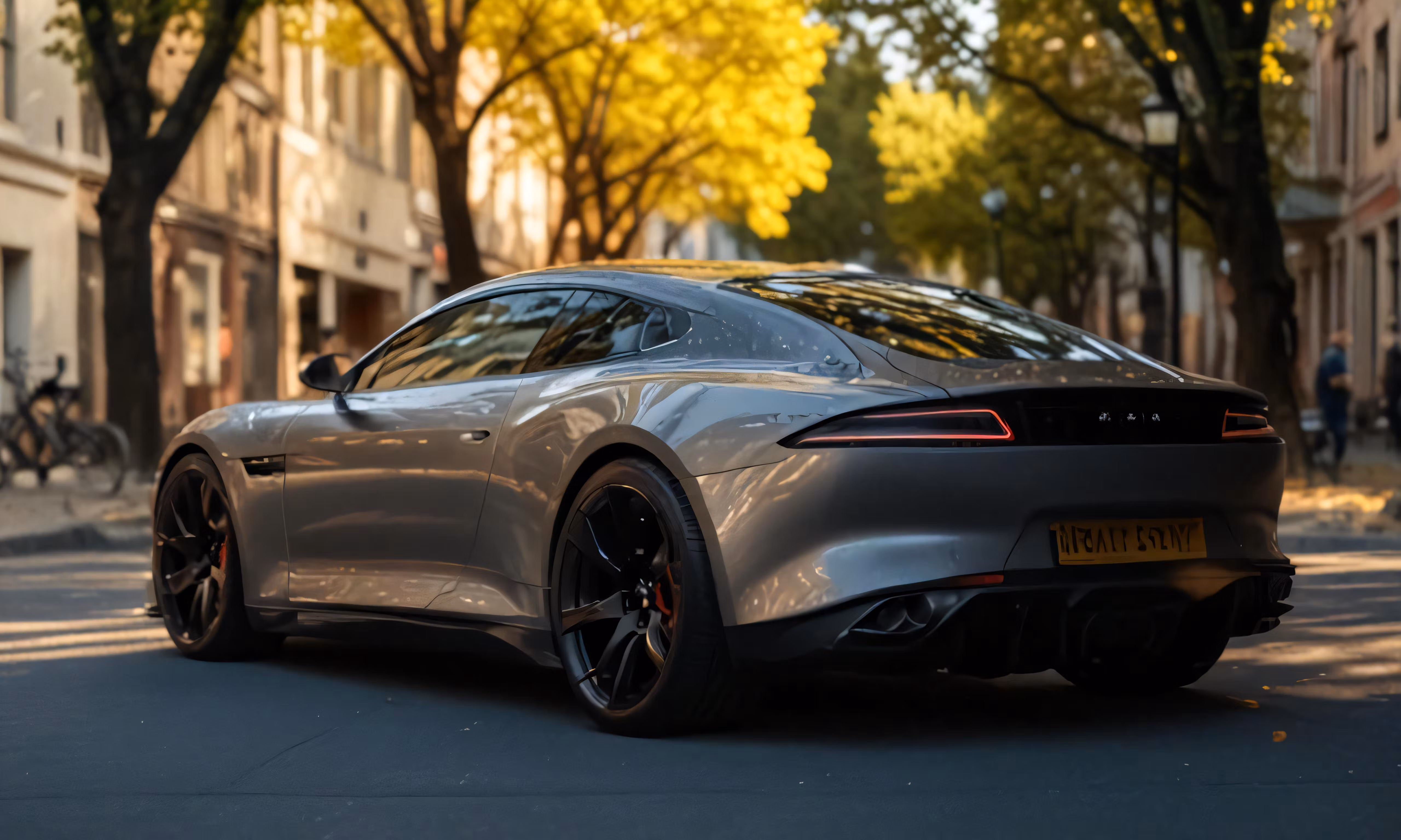 High resolution picture, free to use, a gray sports car sits on the side of a city street