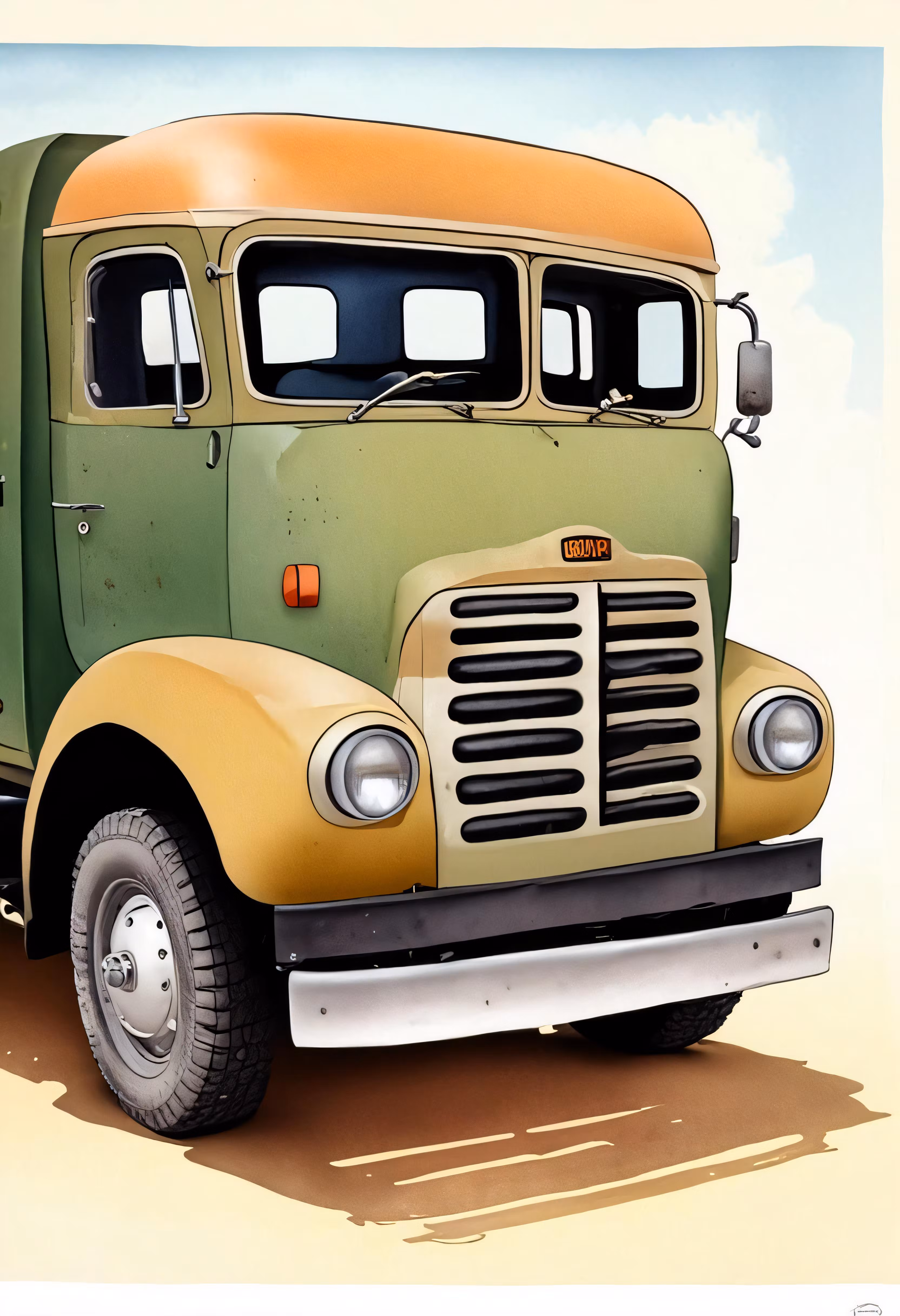 High resolution picture, free to use, a green and tan truck with an orange stripe on the front