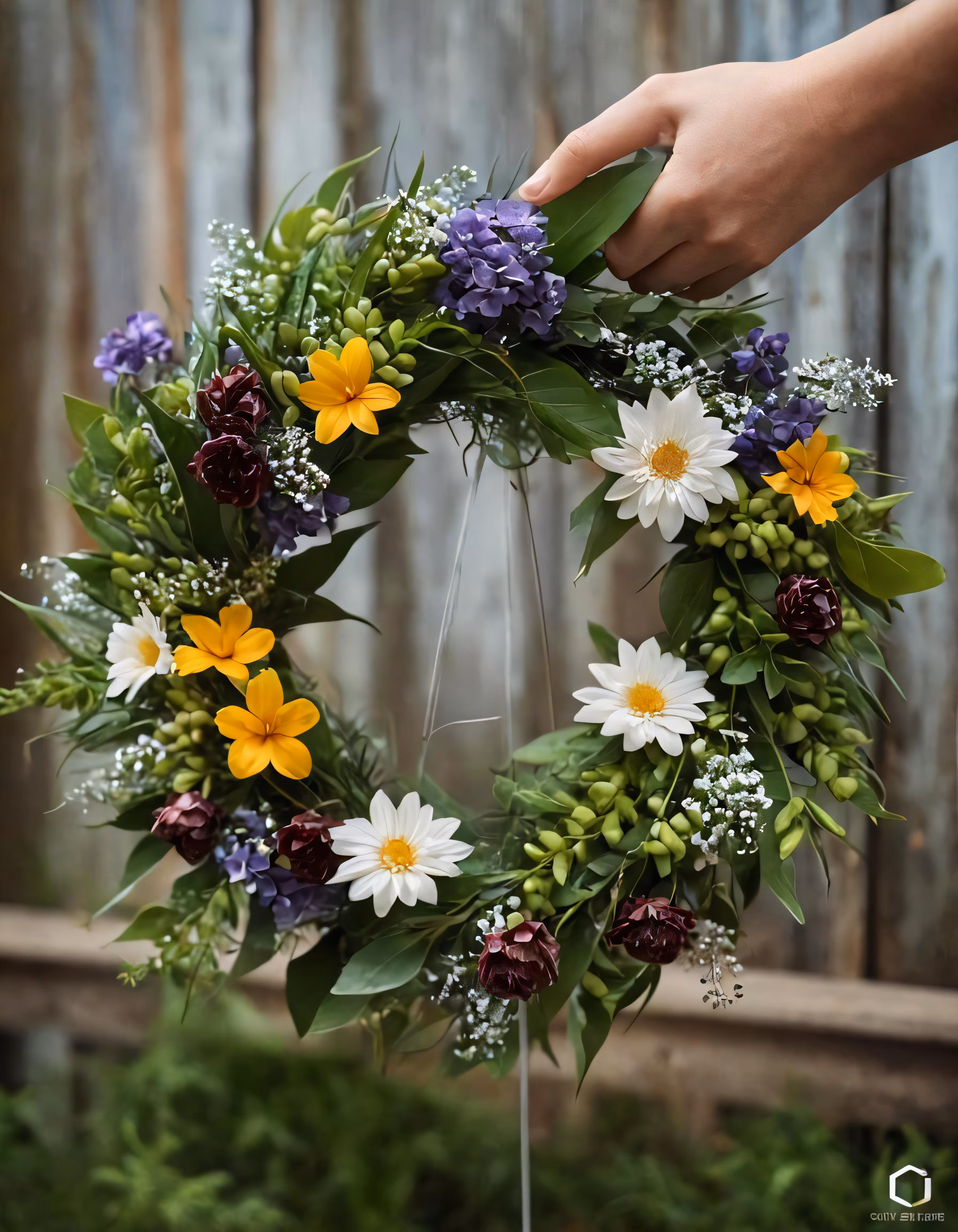 High resolution picture, free to use, a green and white wreath is sitting near some grass