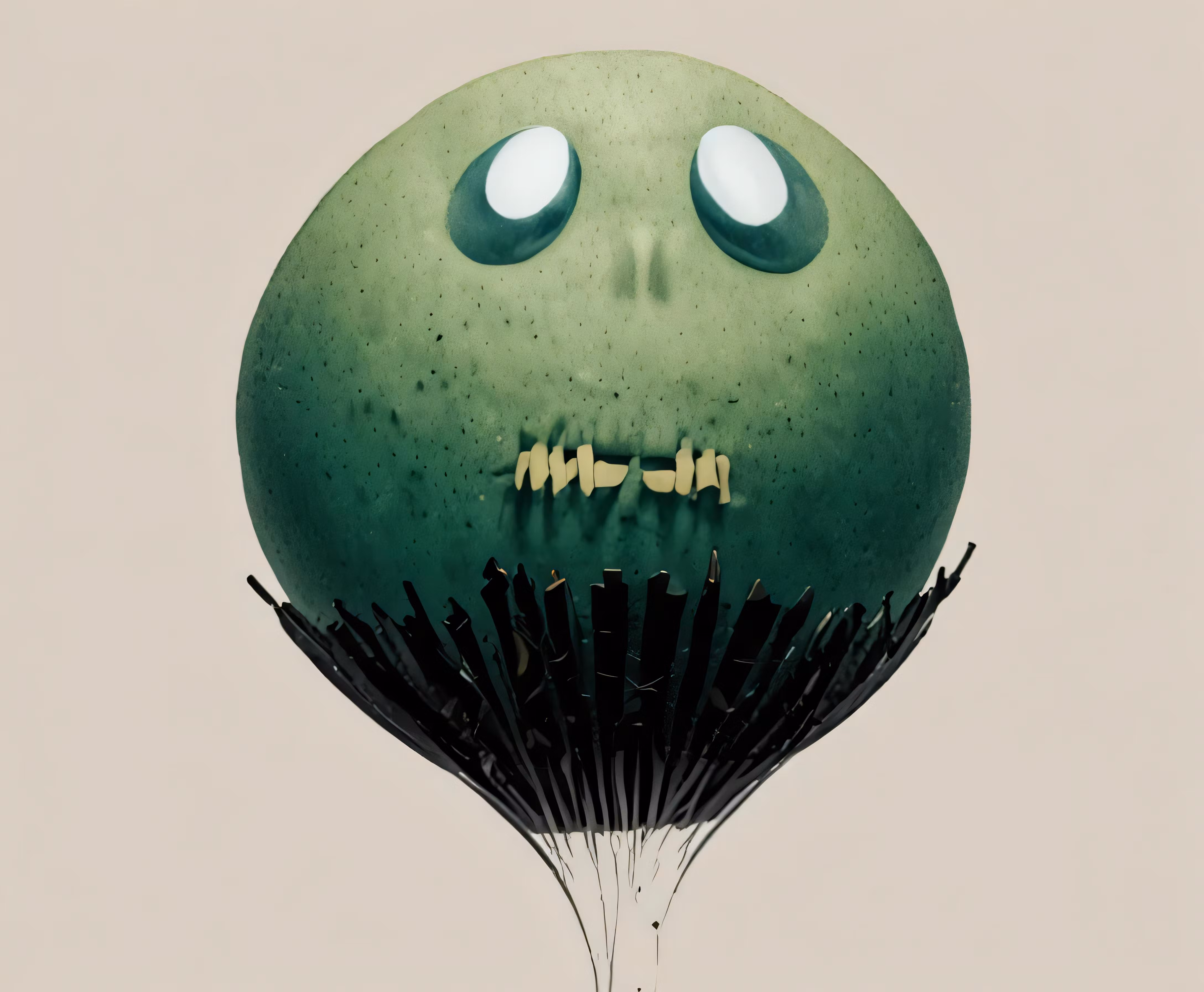 High resolution picture, free to use, a green balloon with white eyes and a weird black hair