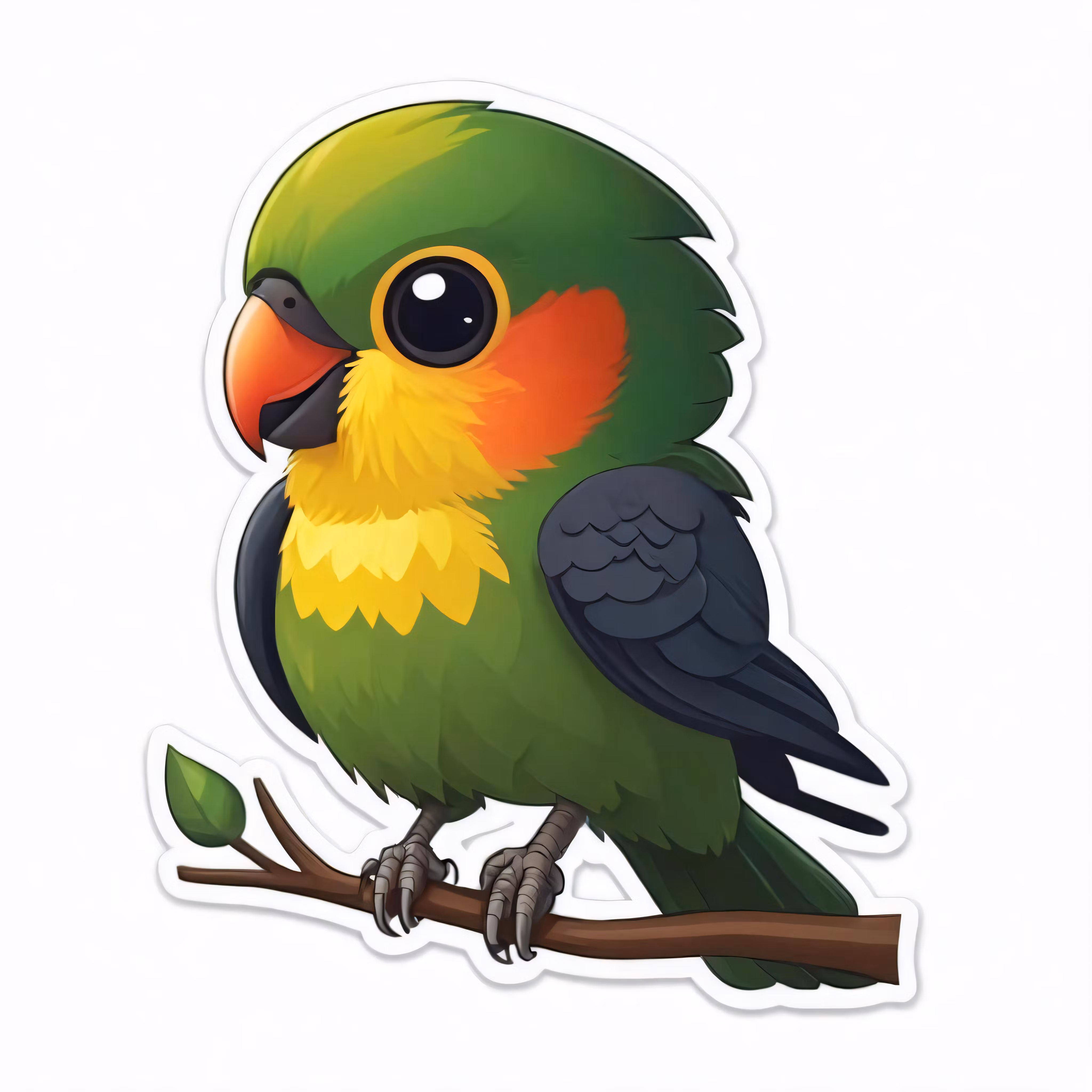 High resolution picture, free to use, a green bird with orange, yellow and black feathers perched on a branch