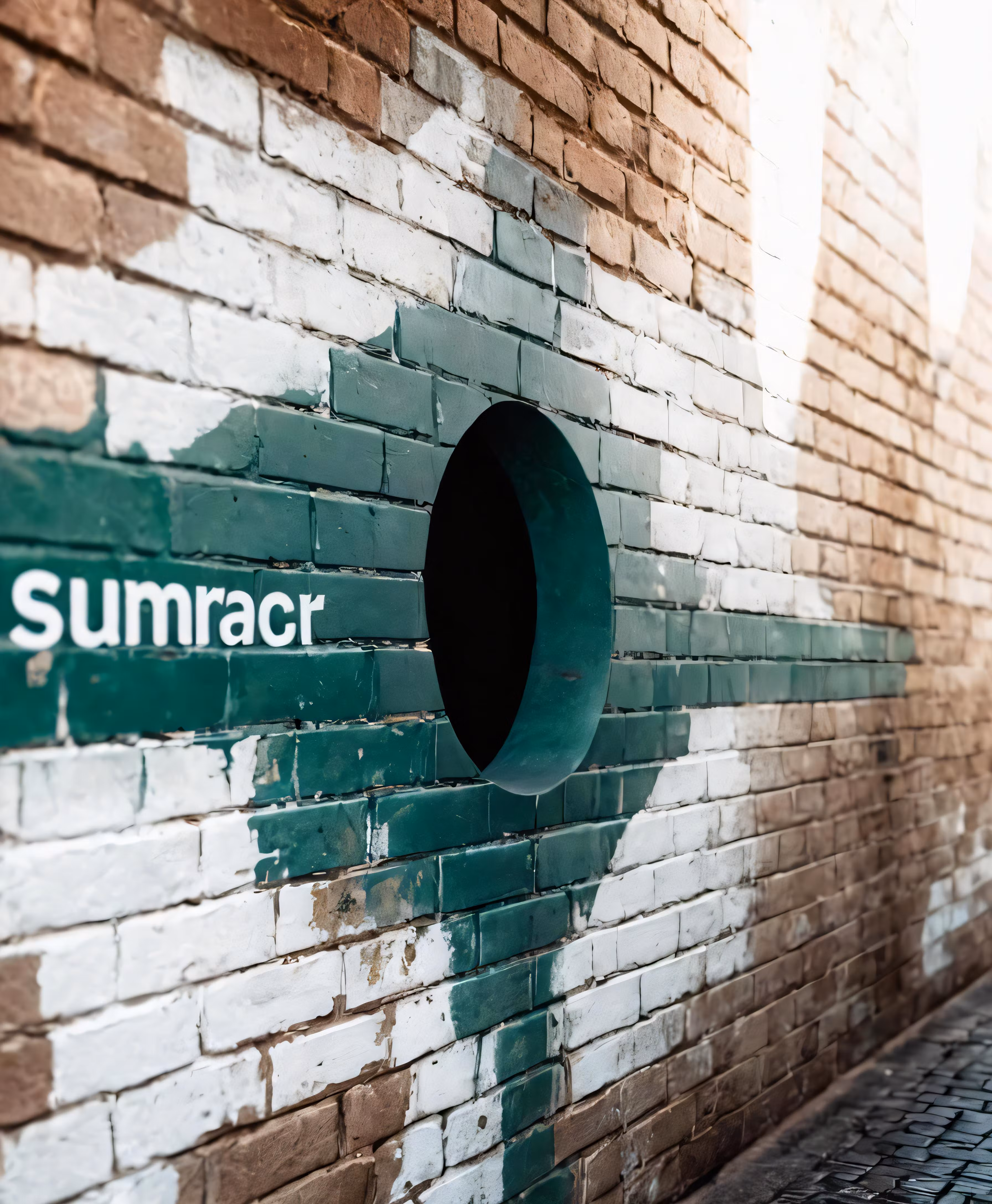 High resolution picture, free to use, a green brick wall painted white with the word sumracc written on it
