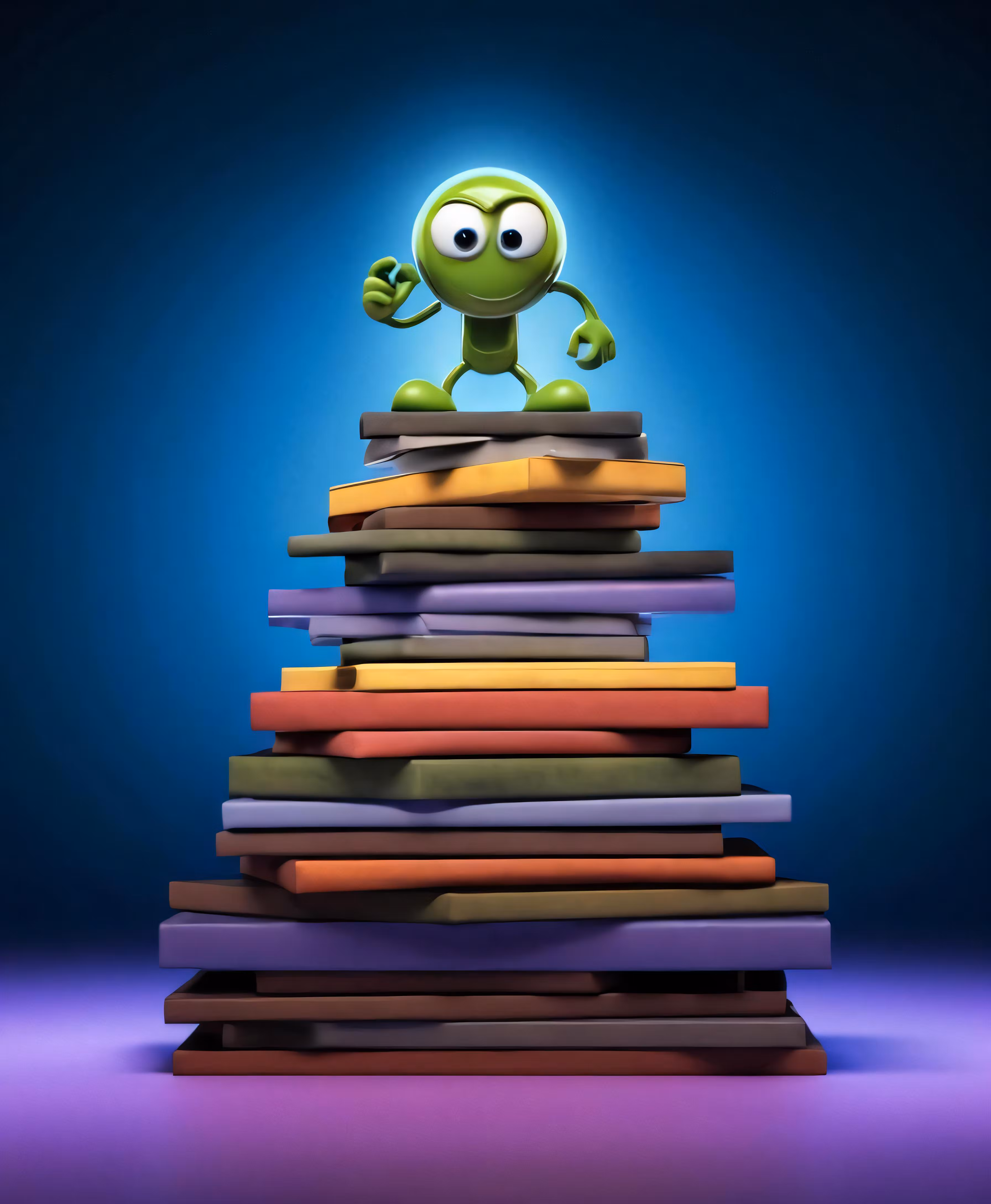 High resolution picture, free to use, a green character is standing on top of a stack of books