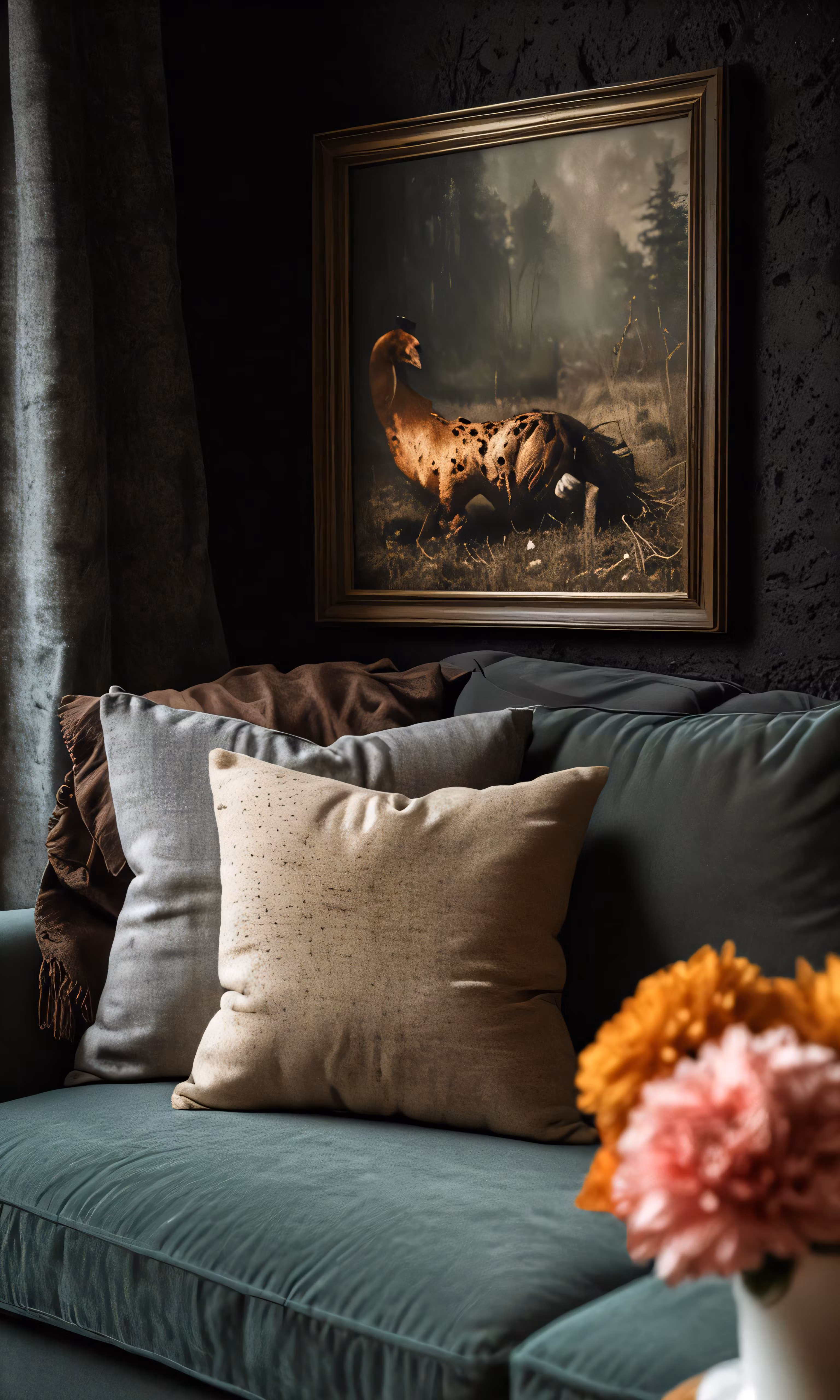 High resolution picture, free to use, a green couch sitting next to a picture of a elk