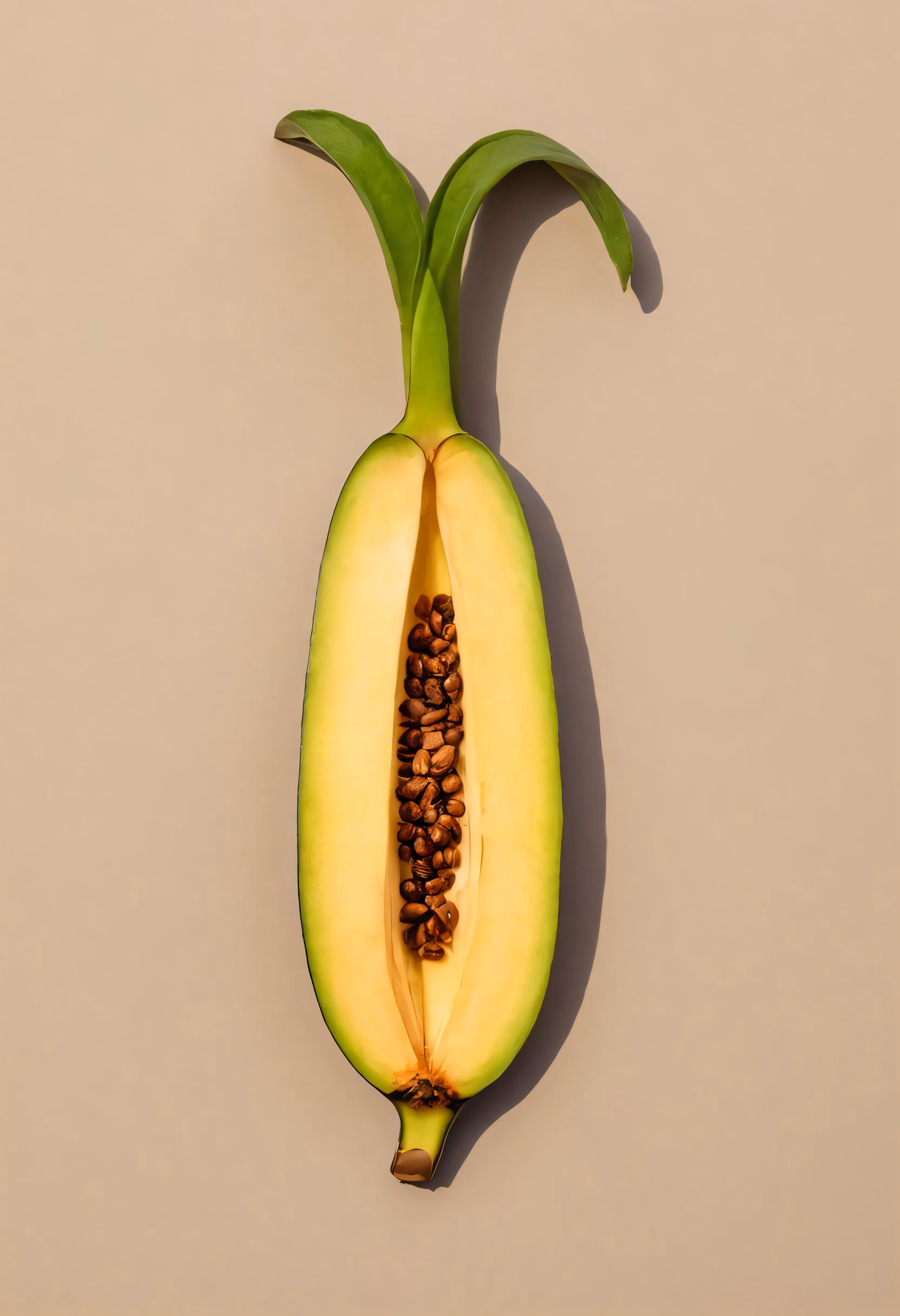 High resolution picture, free to use, a green leafed object is cut open with brown seeds