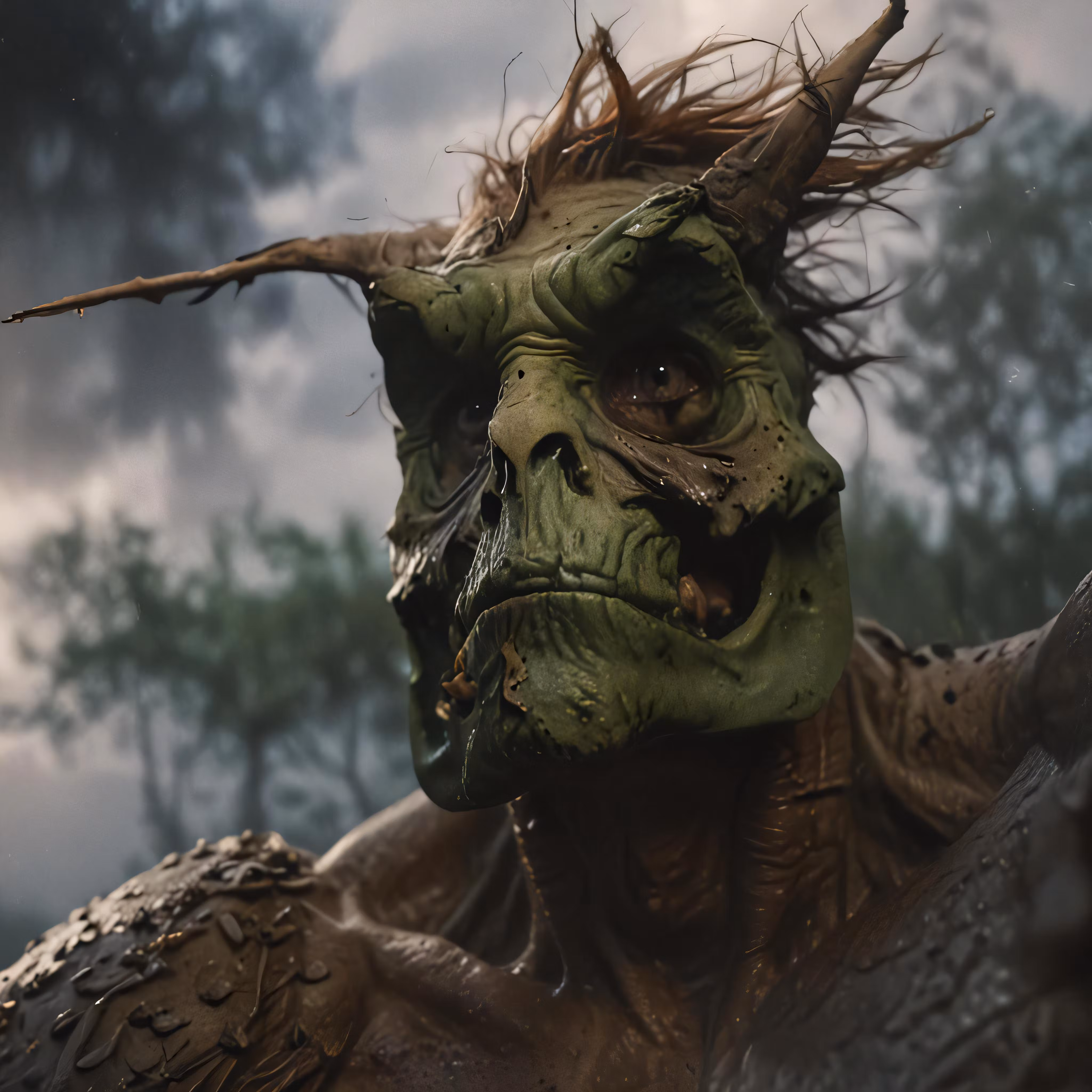 High resolution picture, free to use, a green monster is standing alone on a cloudy day
