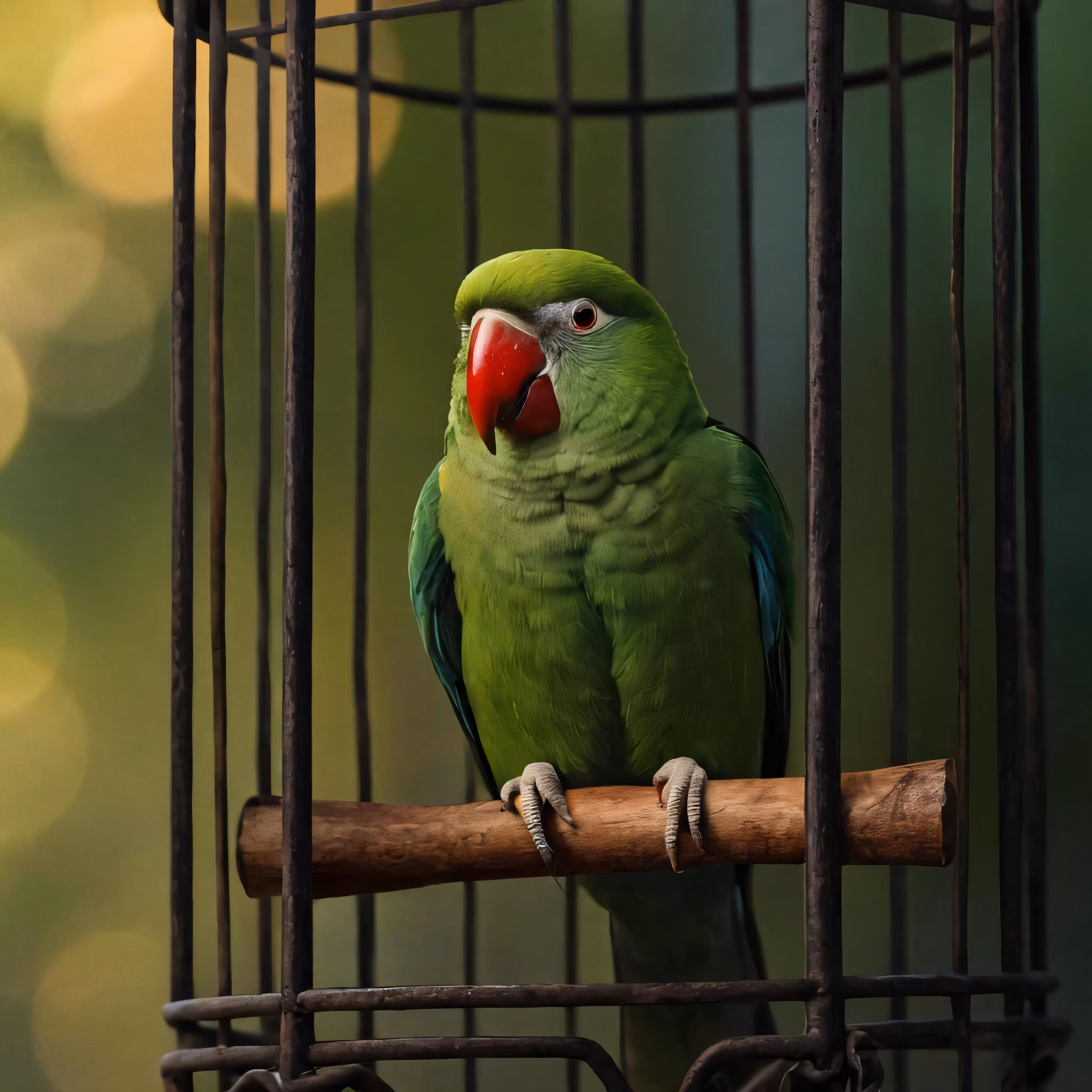 High resolution picture, free to use, a green parrot is sitting inside a cage