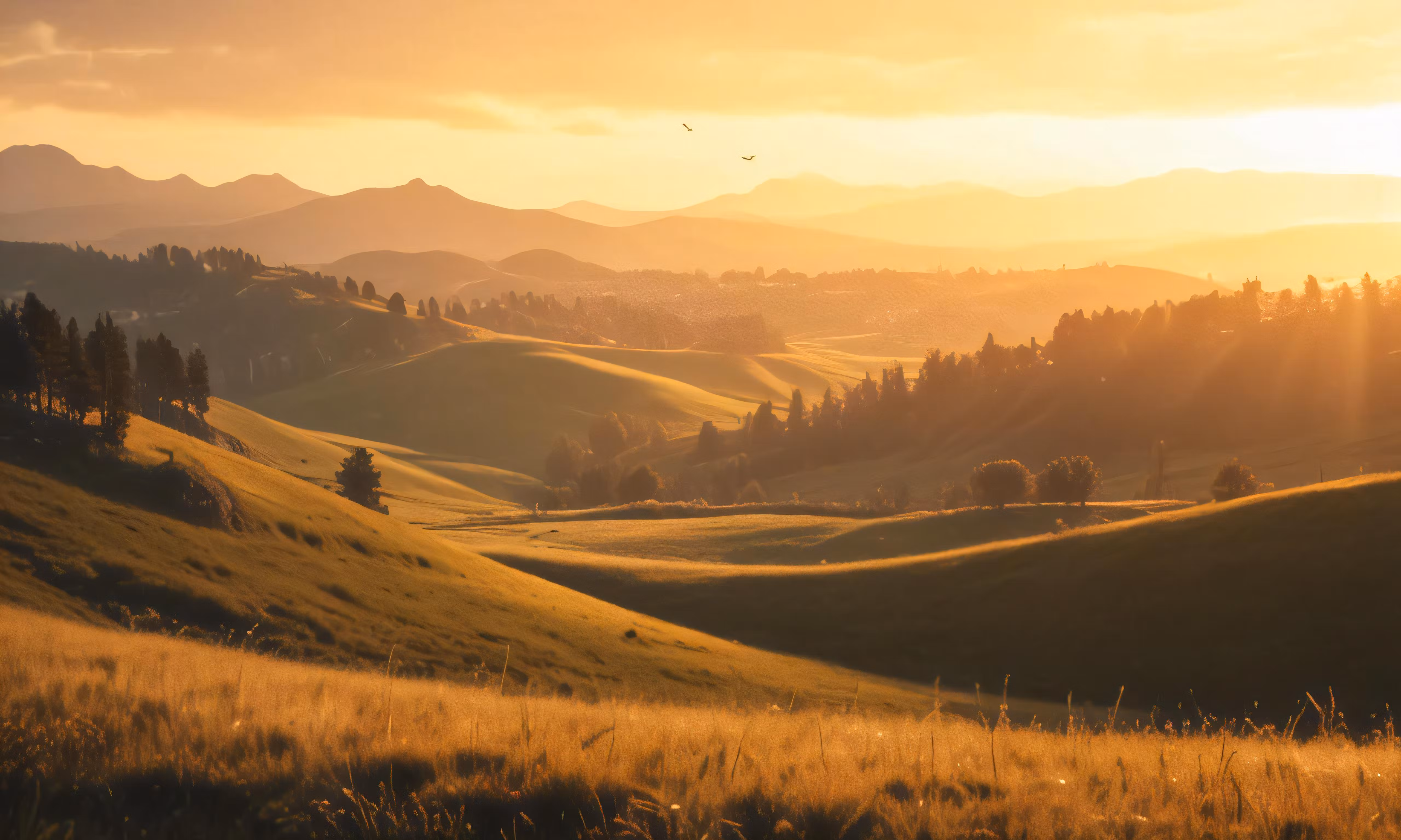 High resolution picture, free to use, a green pasture with some trees and mountains