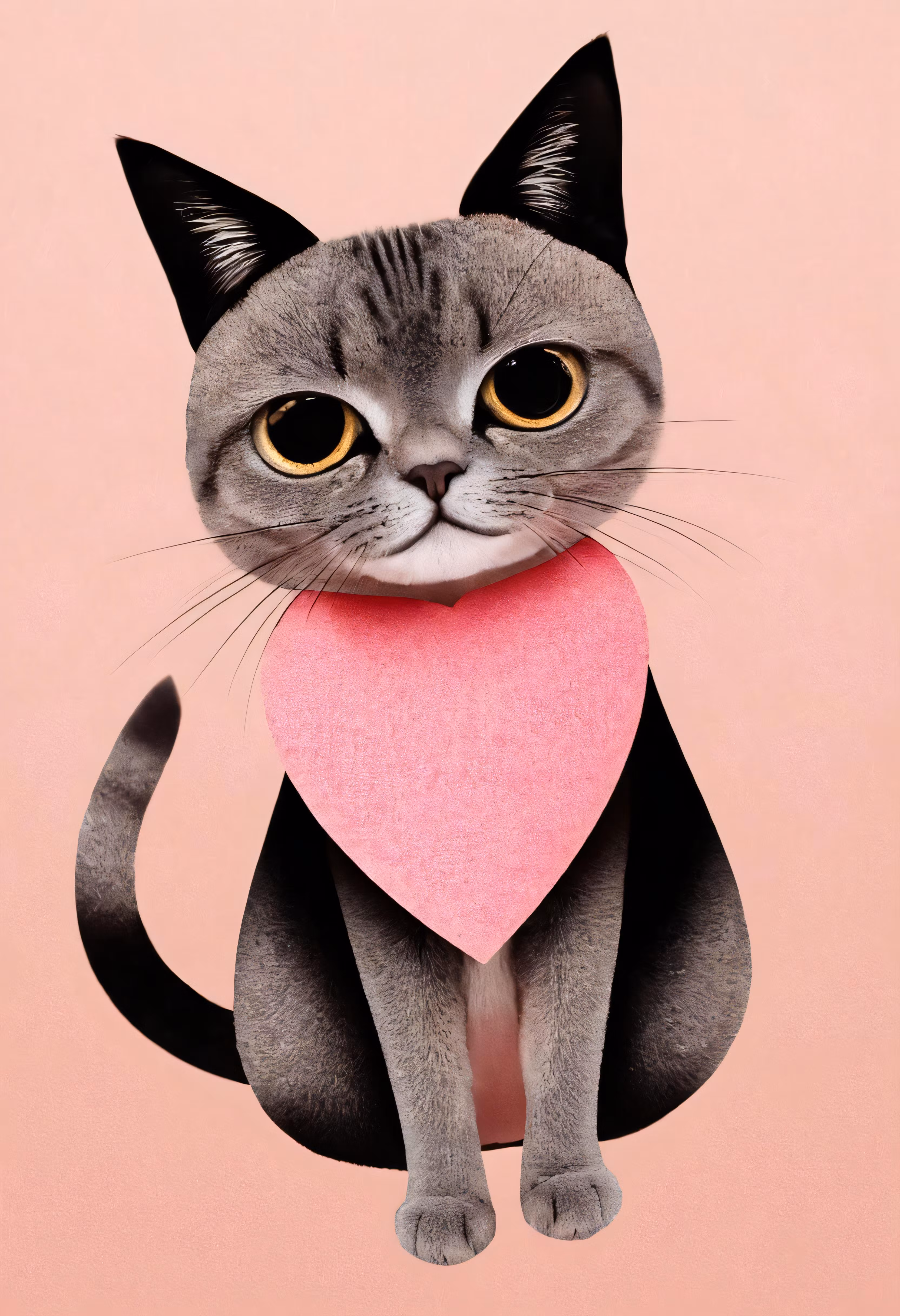 High resolution picture, free to use, a grey cat with a pink heart cut out of its neck