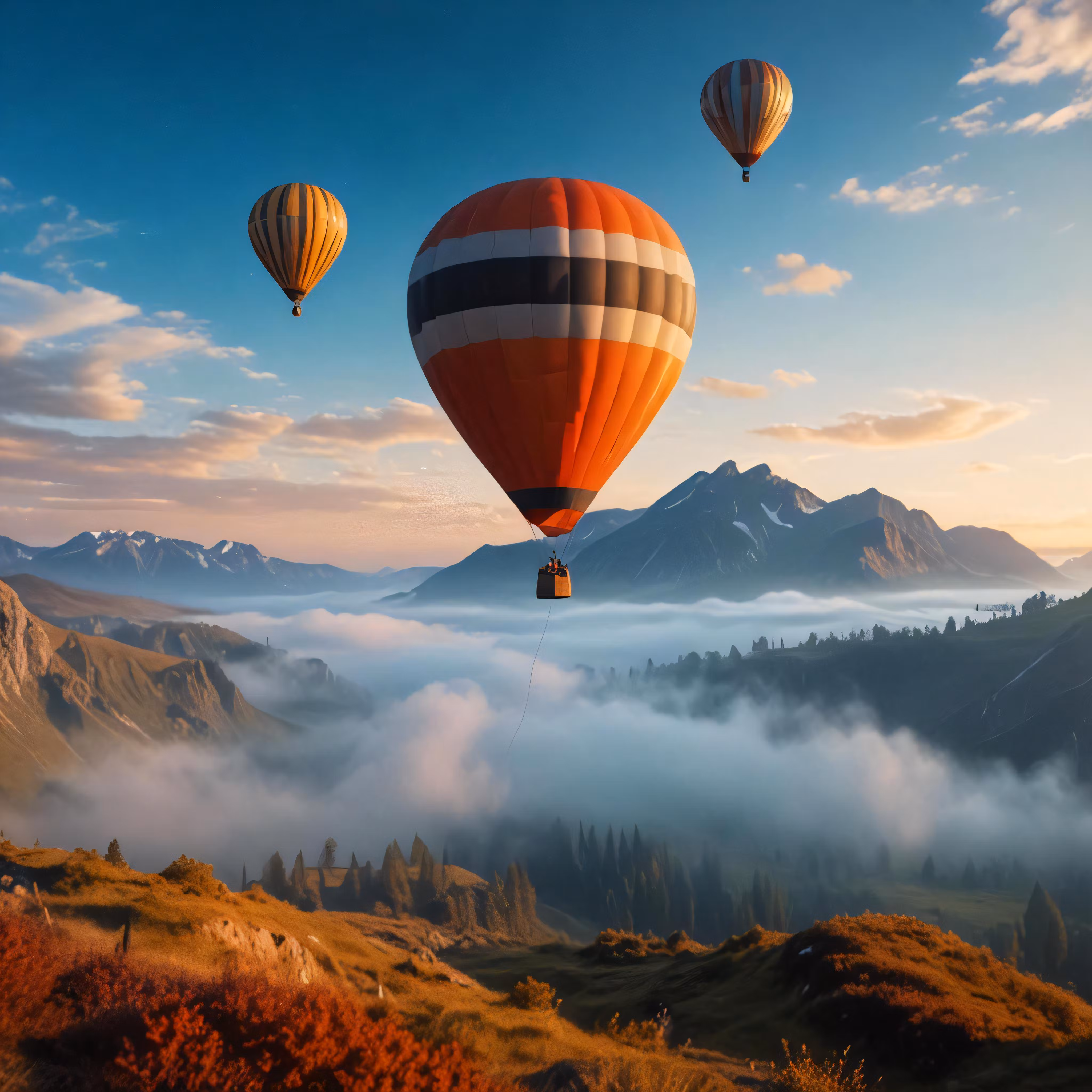 High resolution picture, free to use, a group of hot air balloons flying over mountains