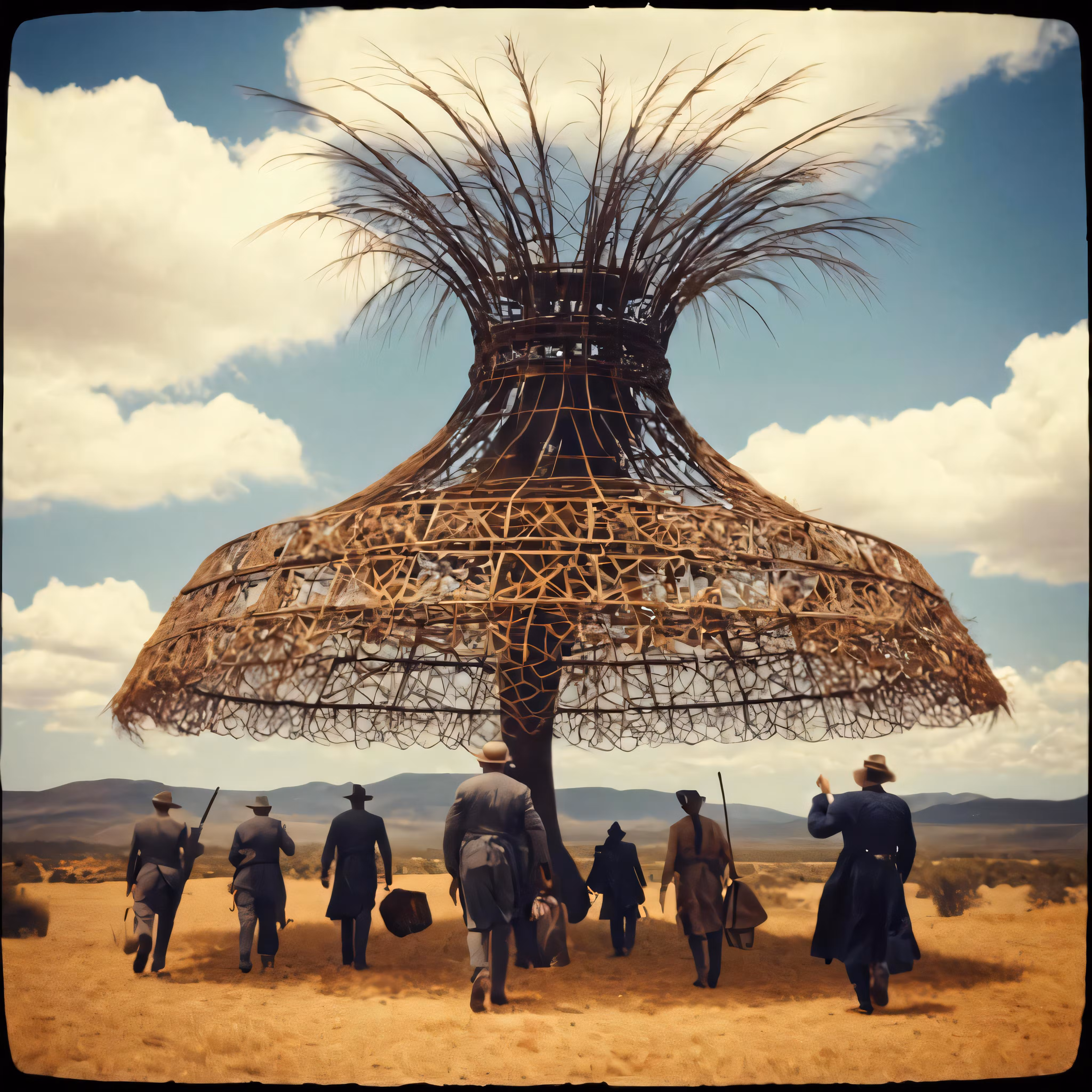 High resolution picture, free to use, a group of men in uniform standing under a large straw umbrella