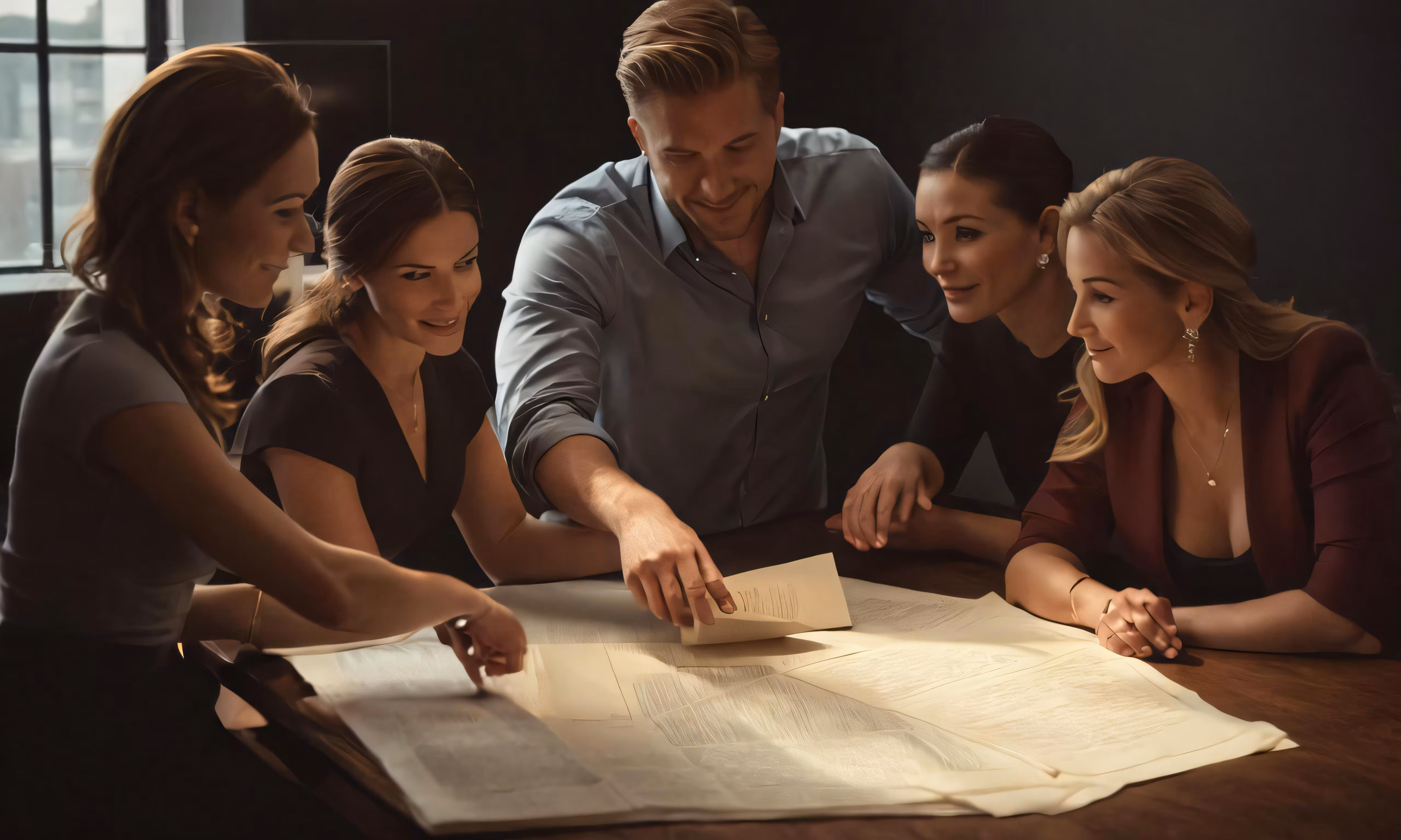 High resolution picture, free to use, a group of people sit at a table together, one is pointing out a book