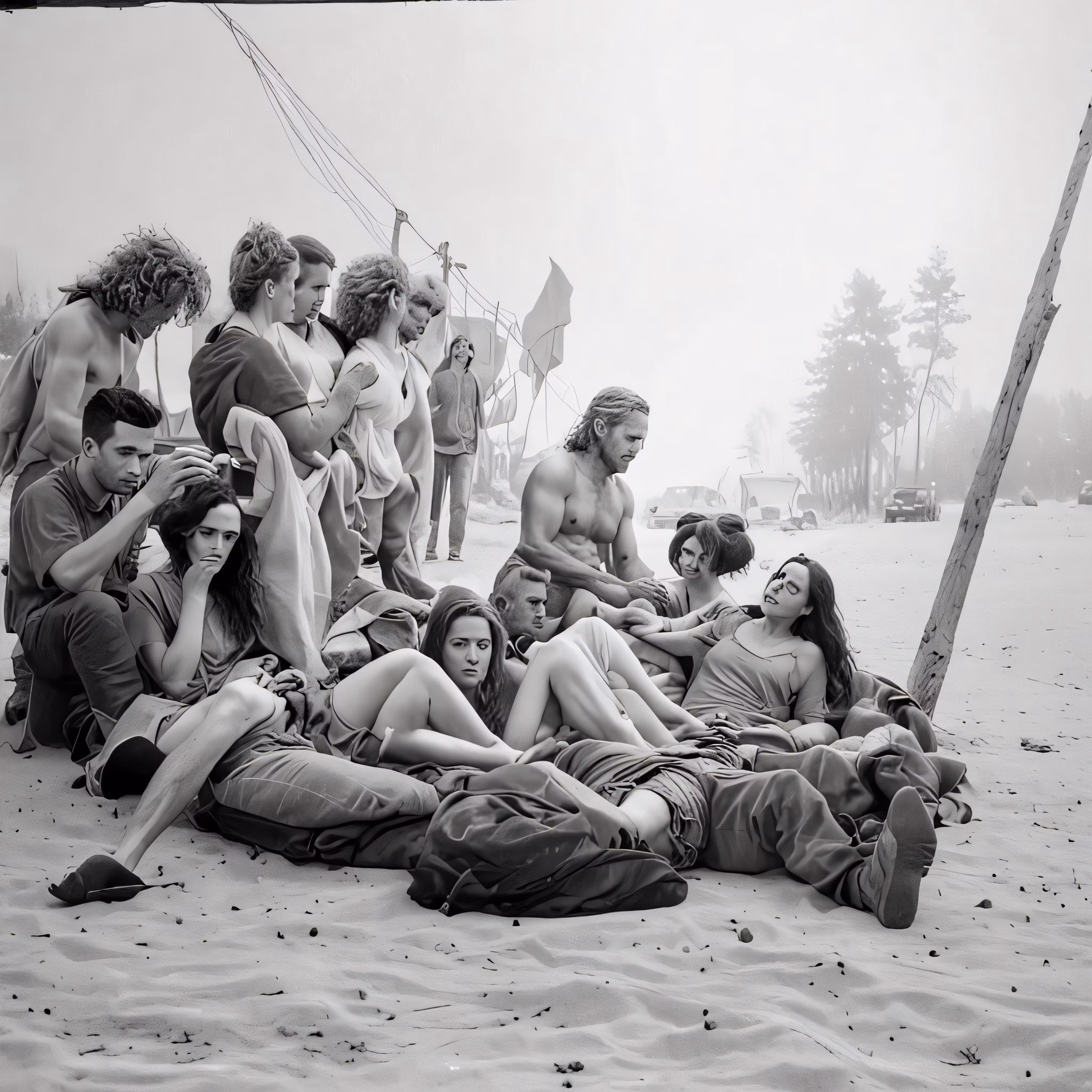 High resolution picture, free to use, a group of people sitting and standing around on the beach