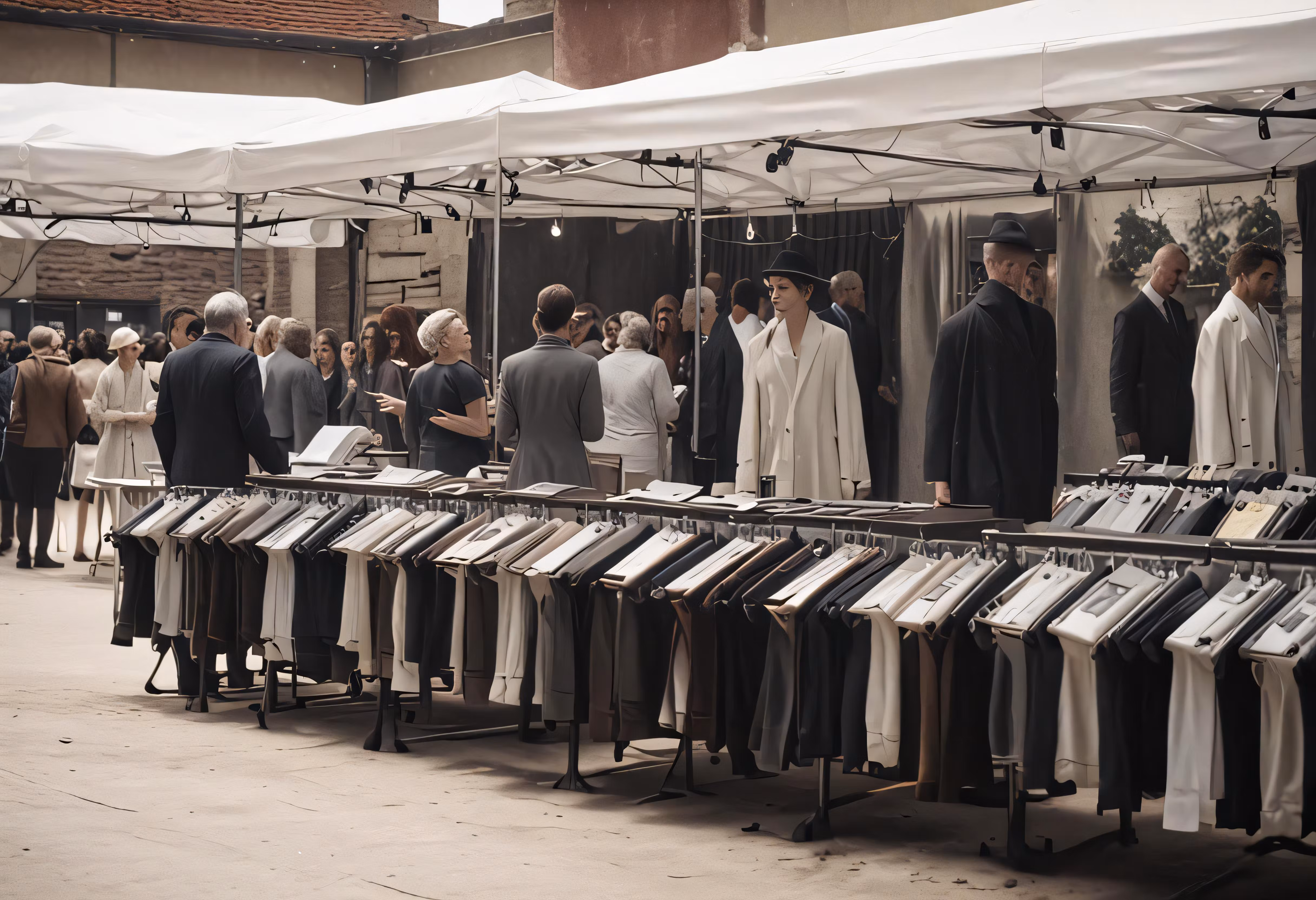 High resolution picture, free to use, a group of people standing under tables with stacks of books