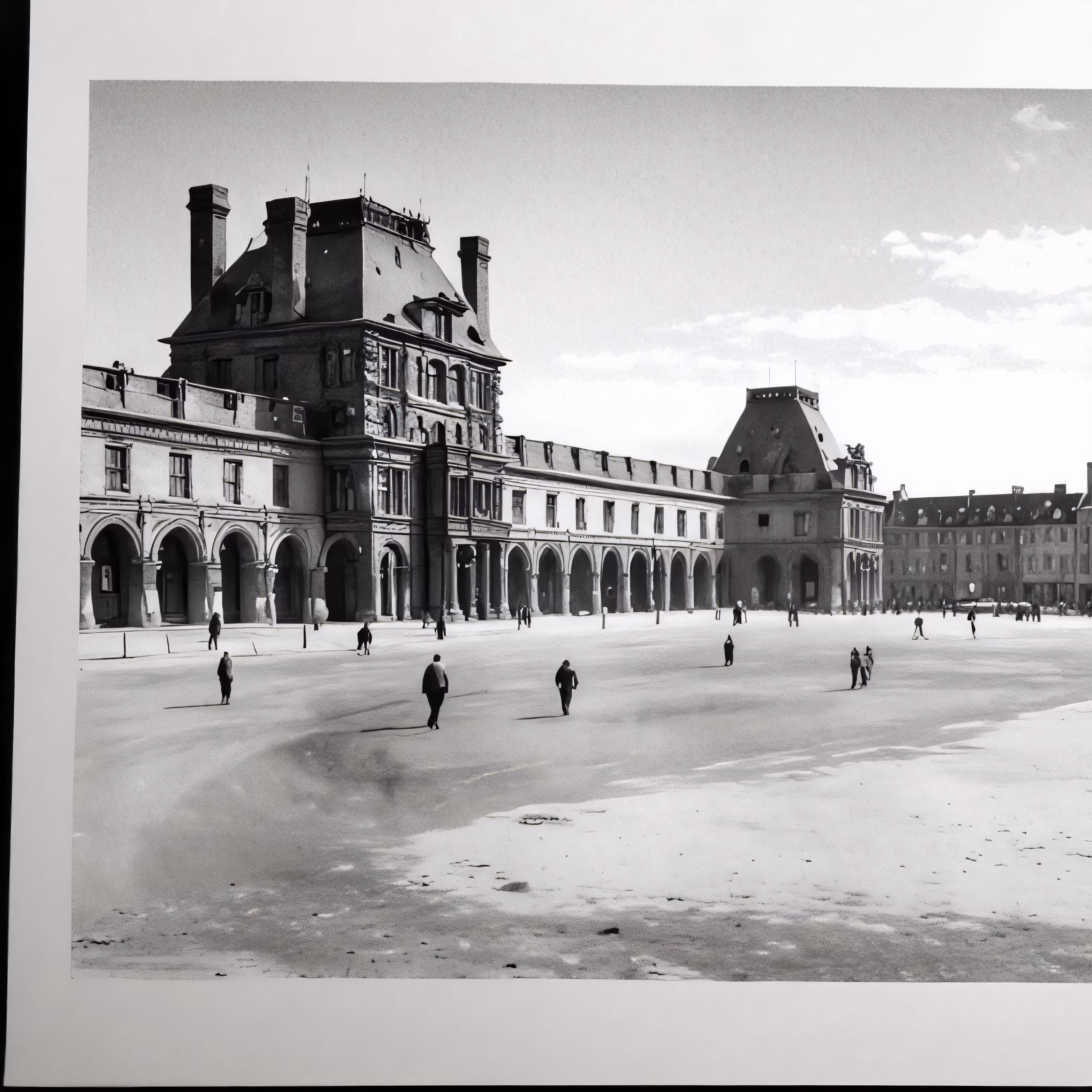 High resolution picture, free to use, a group of people walking down a sandy beach near an old building