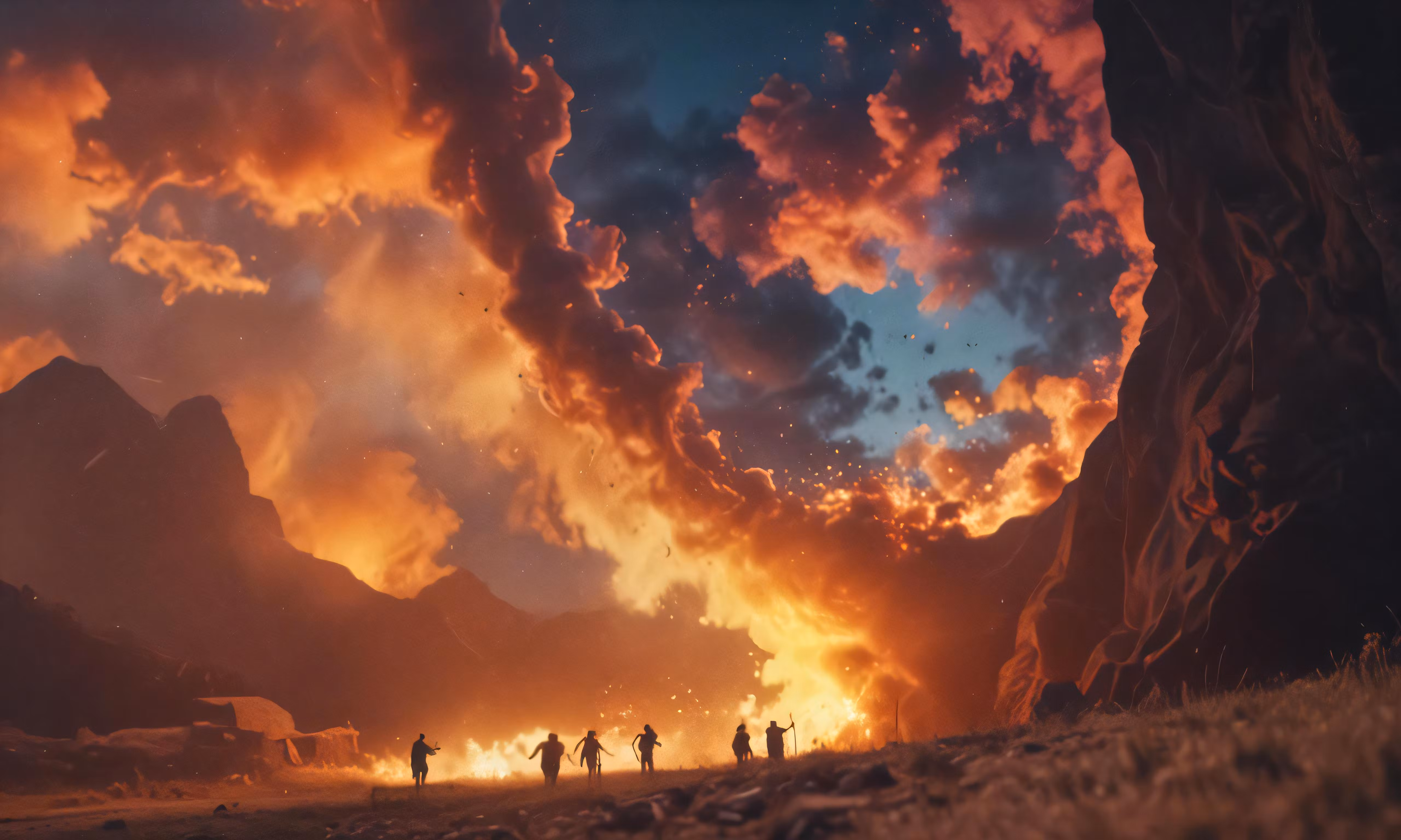 High resolution picture, free to use, a group of people walking on a field under a fire