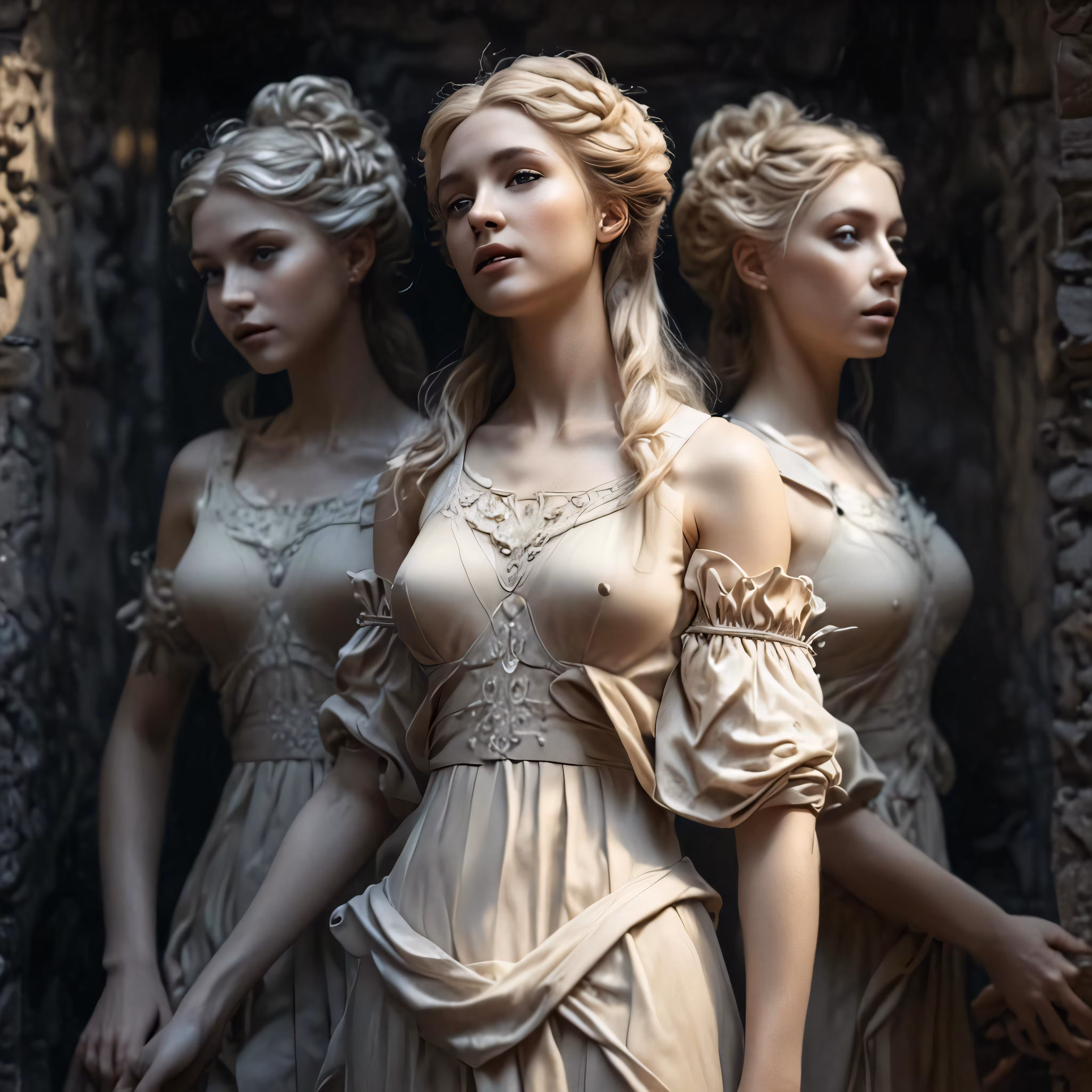 High resolution picture, free to use, a group of three beautiful female statues posing for a photo