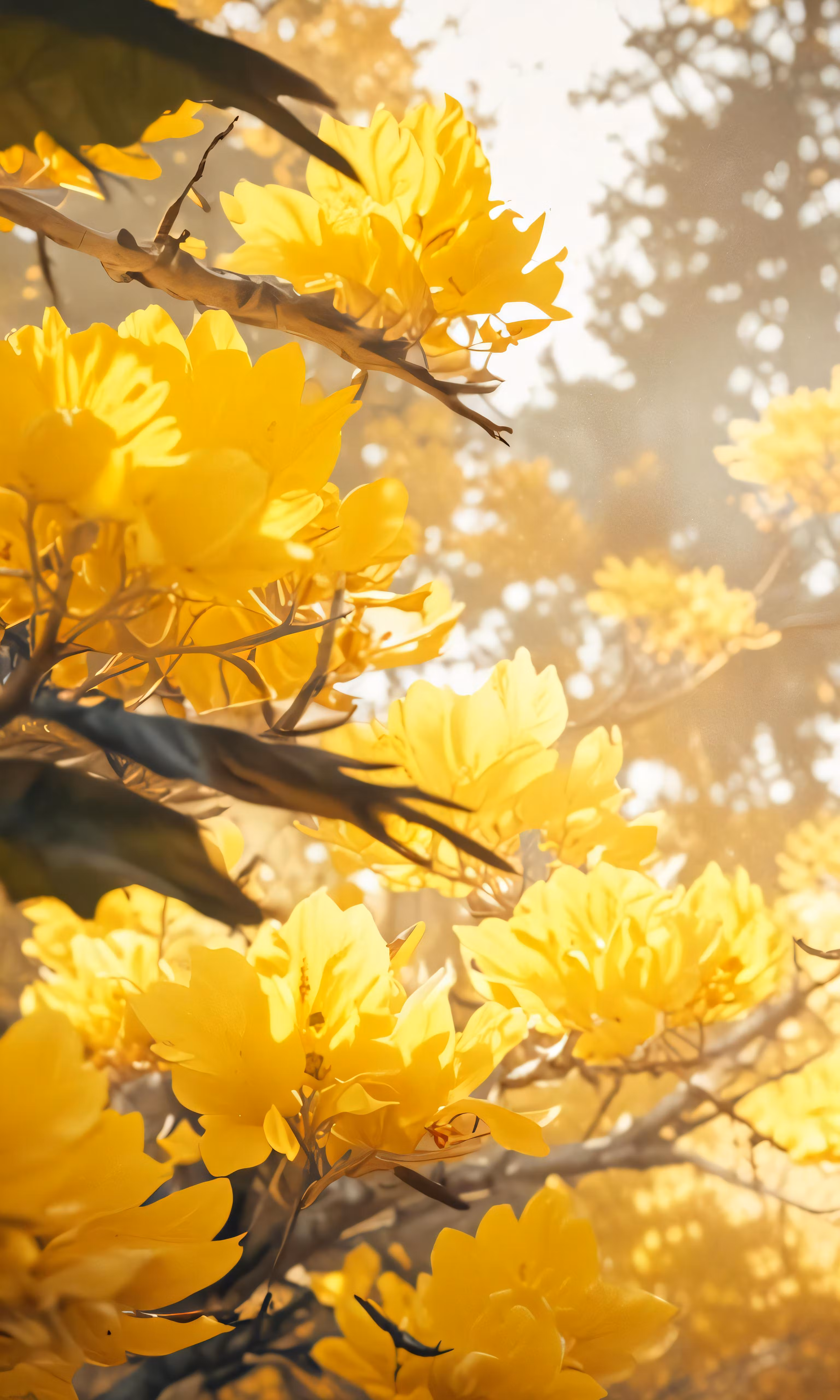 High resolution picture, free to use, a group of yellow flowers with sunshine shining on them