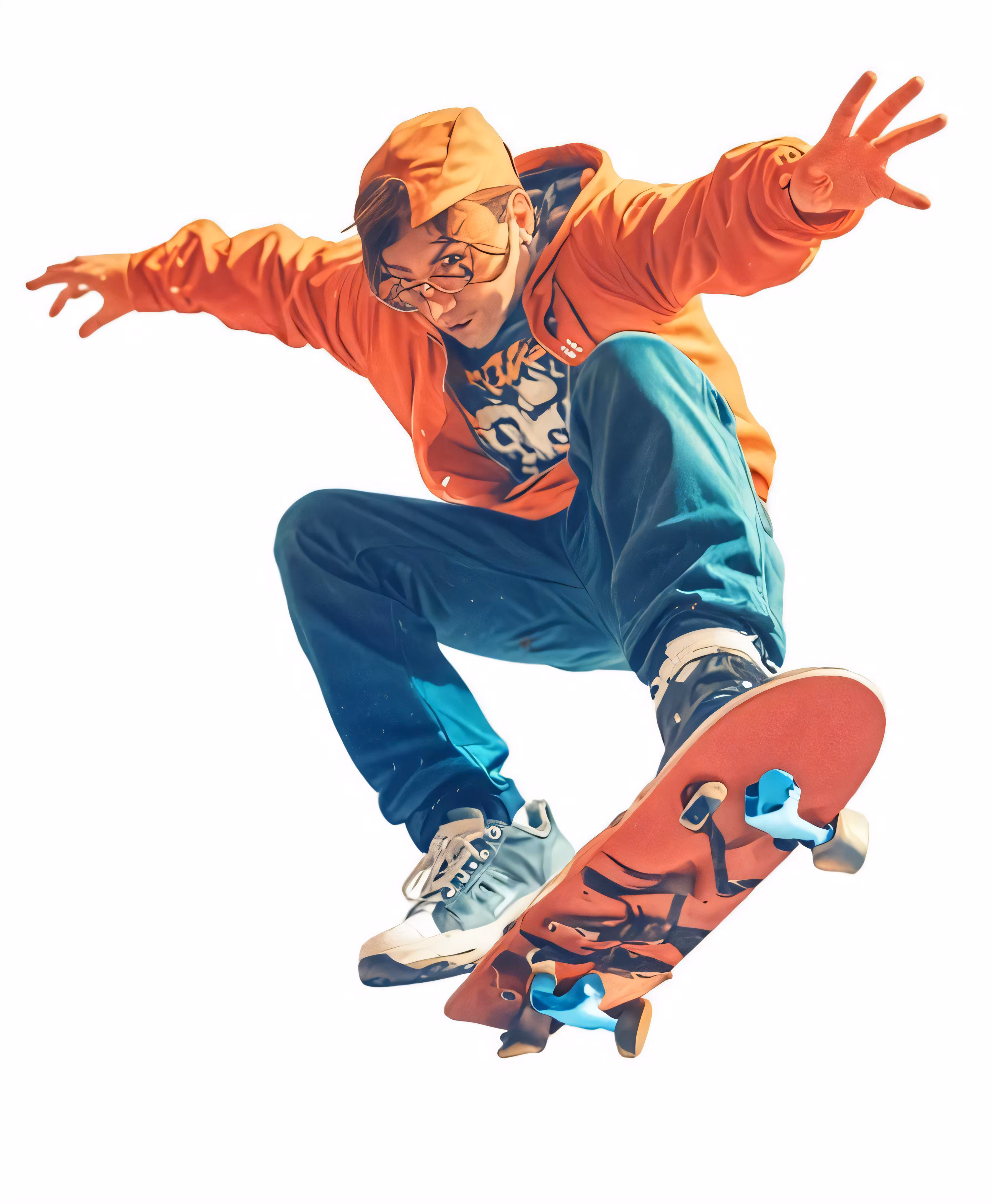 High resolution picture, free to use, a guy in a sweater is doing tricks on his skateboard