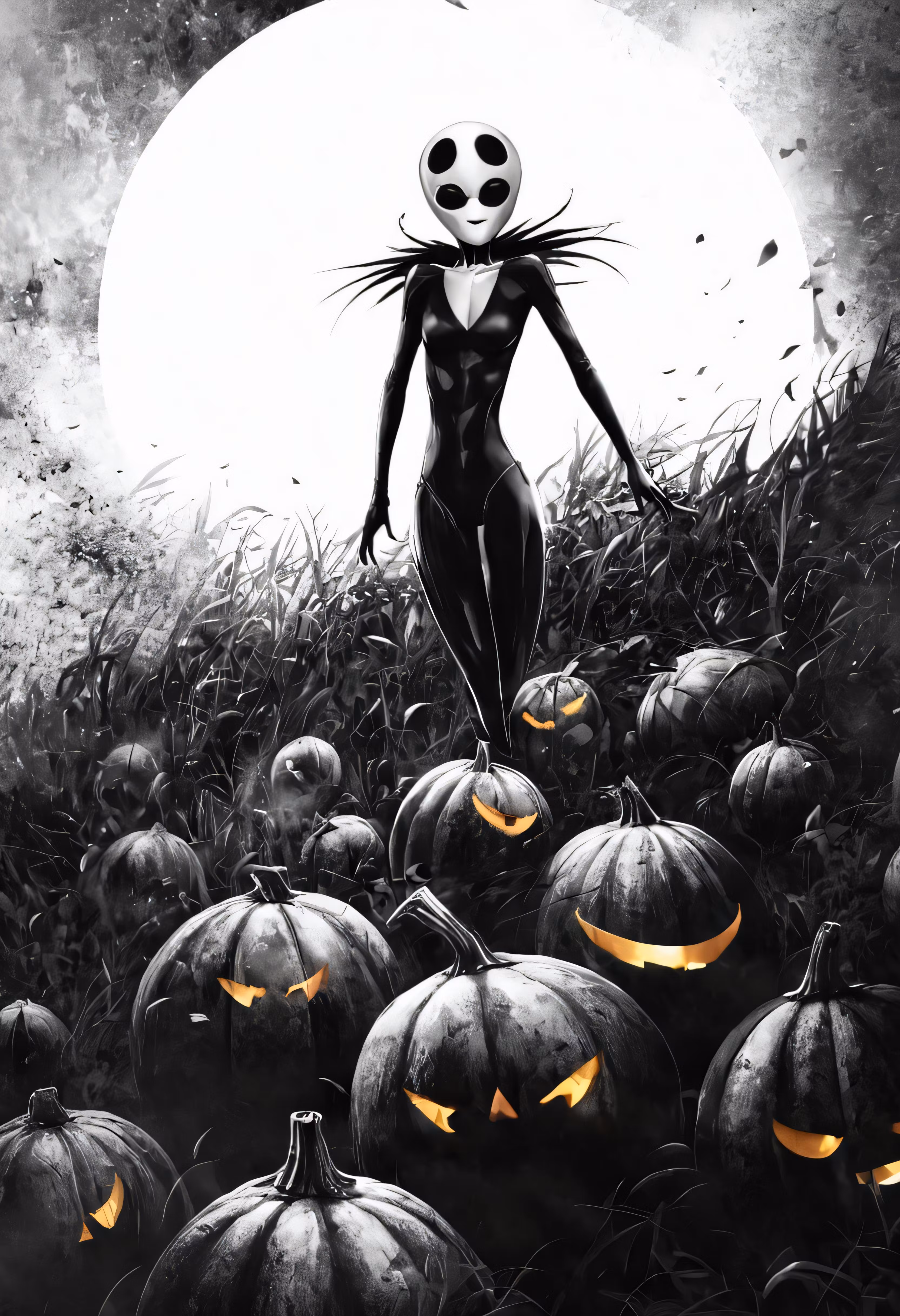 High resolution picture, free to use, a halloween image of jack skellingon among pumpkins