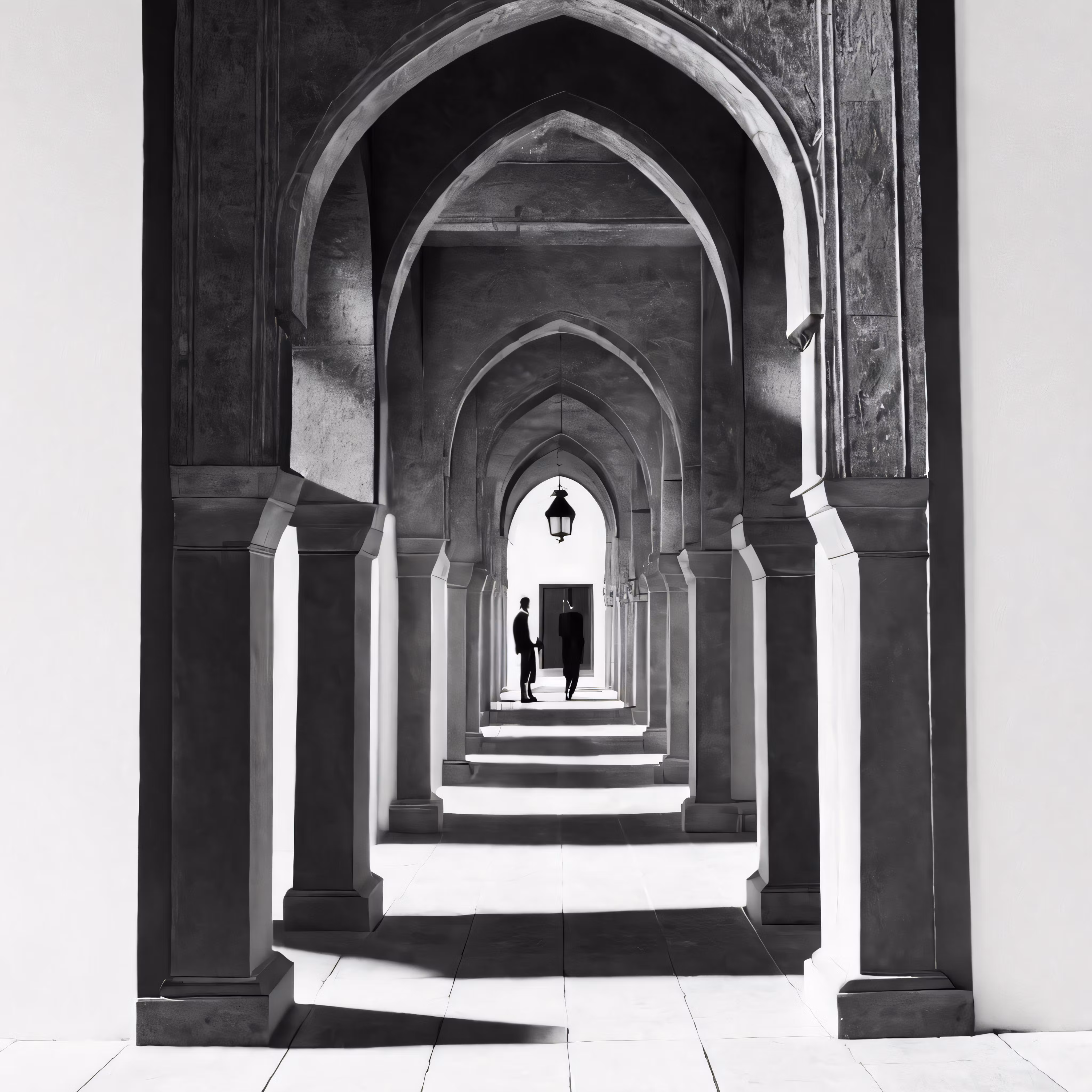 High resolution picture, free to use, a hallway in a building with columns and two men standing under a lantern