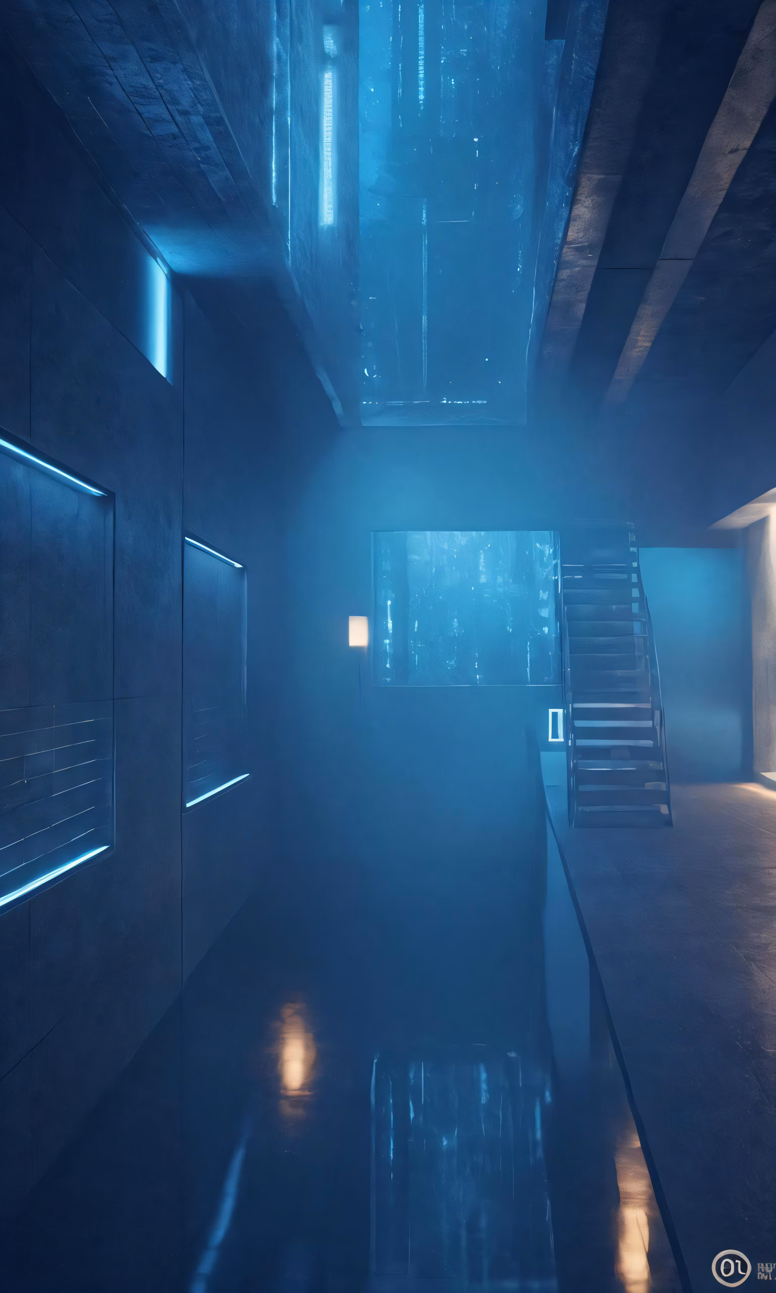 High resolution picture, free to use, a hallway in the house is bathed in blue lights