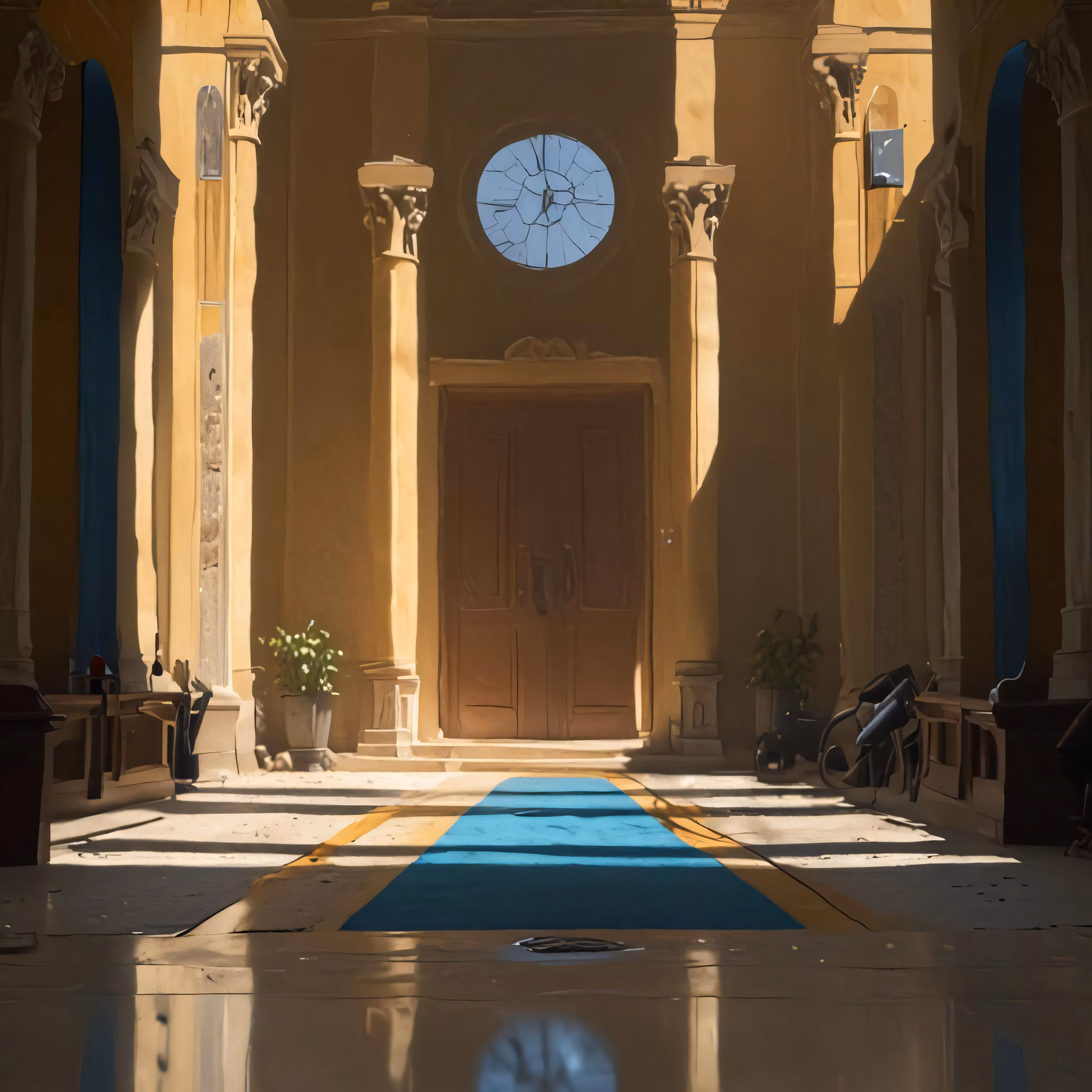 High resolution picture, free to use, a hallway with a blue carpet and arched doorways