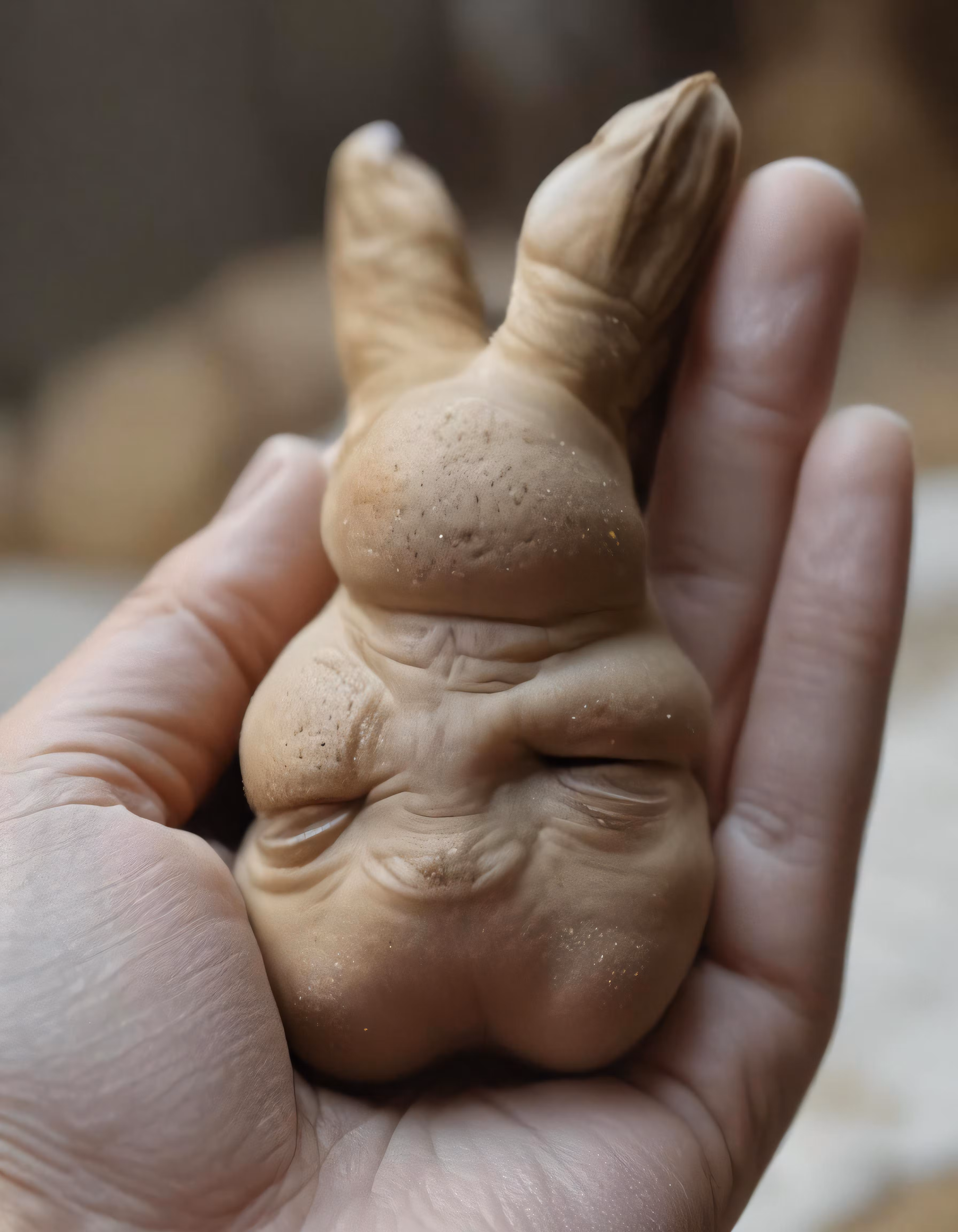 High resolution picture, free to use, a hand holding a clay figure that looks like a little sleeping baby