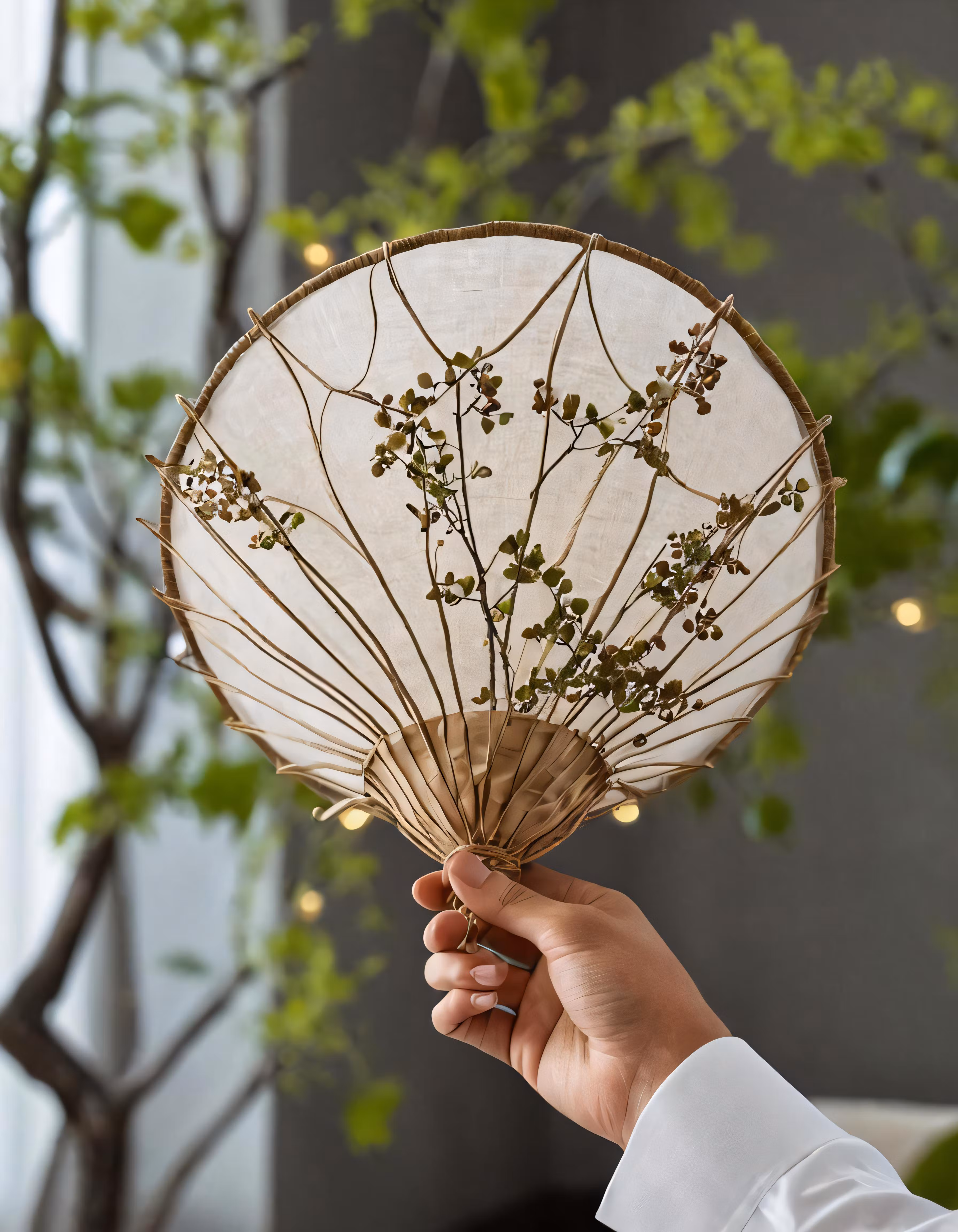 High resolution picture, free to use, a hand holding up a large fan with branches in it