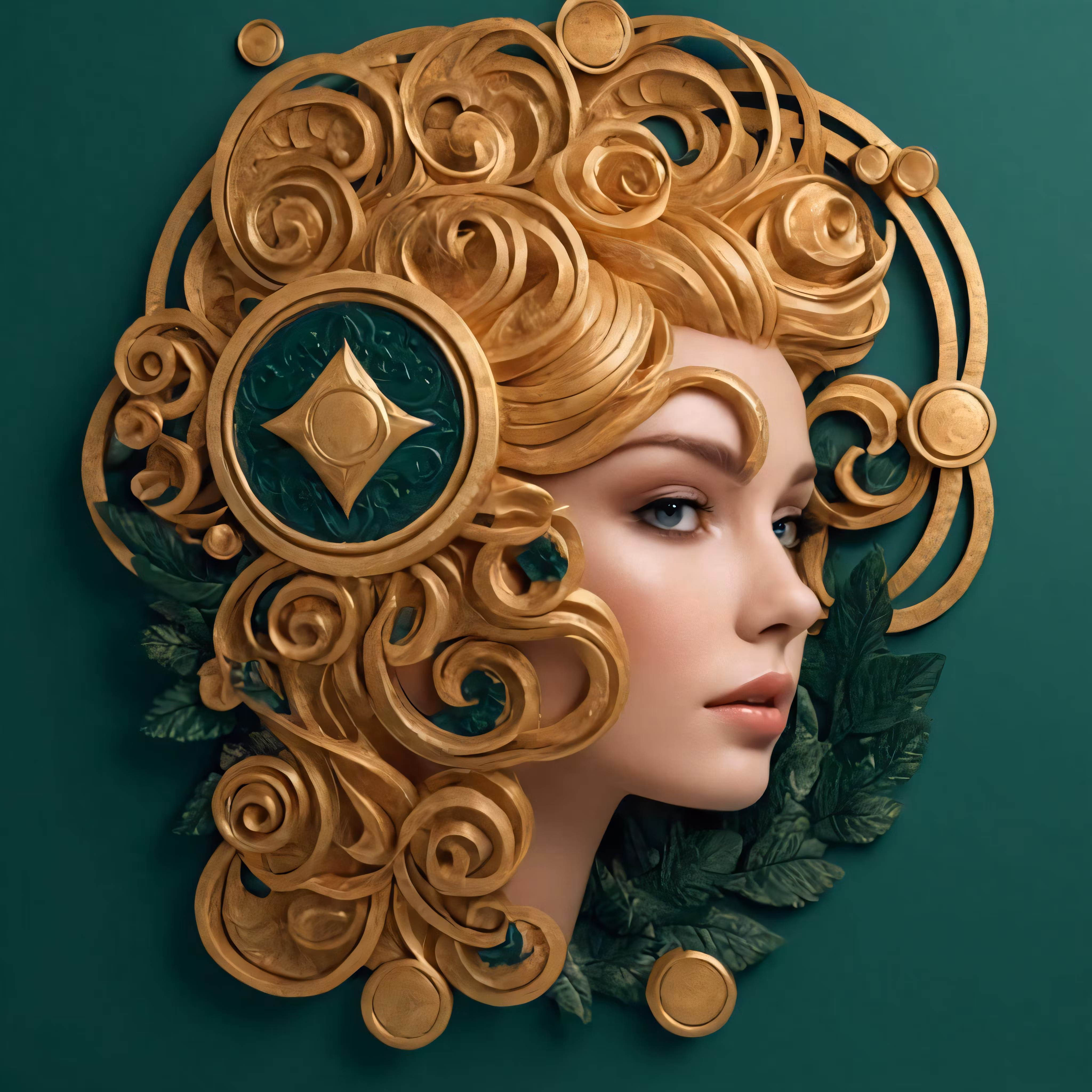 High resolution picture, free to use, a head of a mannequin wearing a gold broach and green jewels