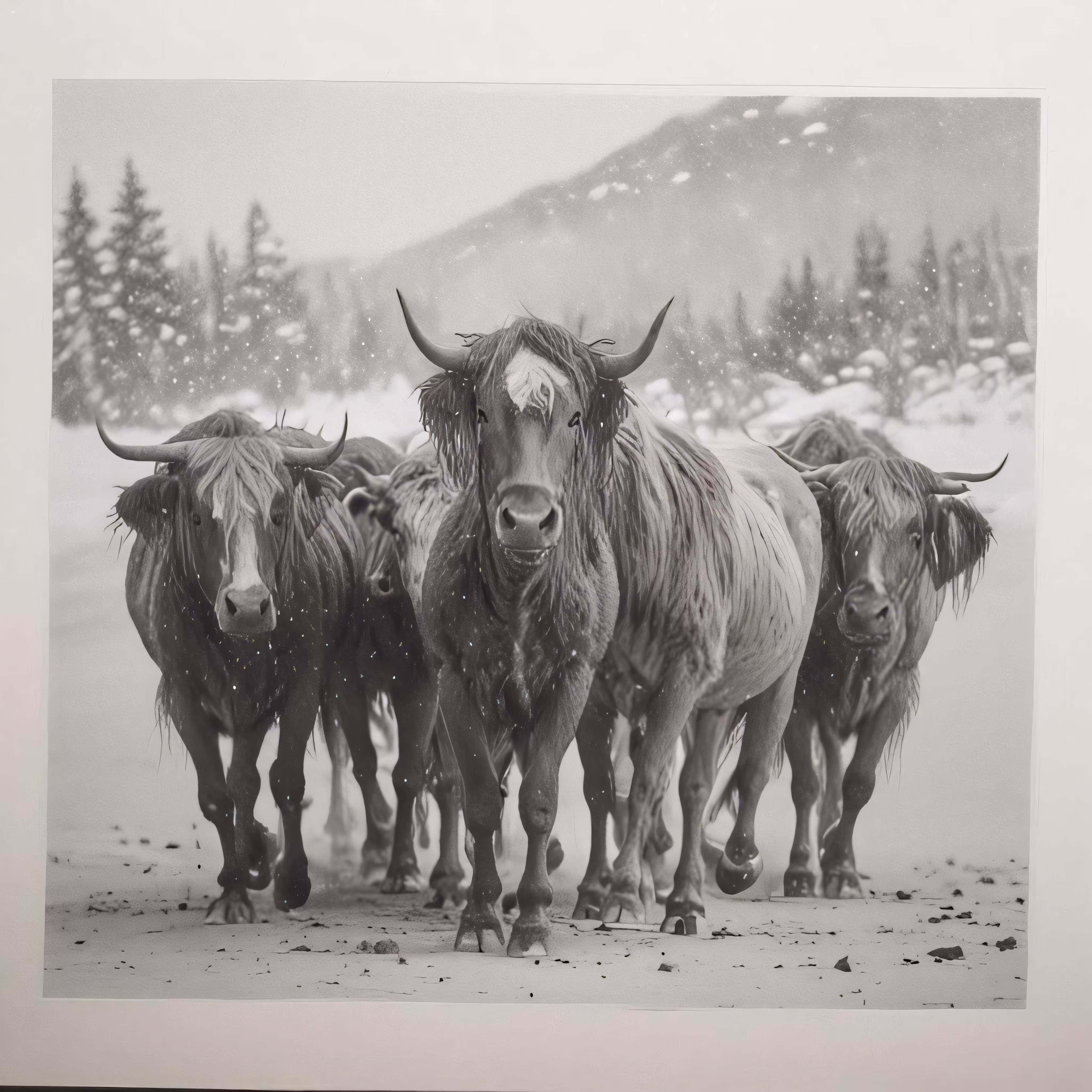 High resolution picture, free to use, a herd of cattle walking along a snow covered slope