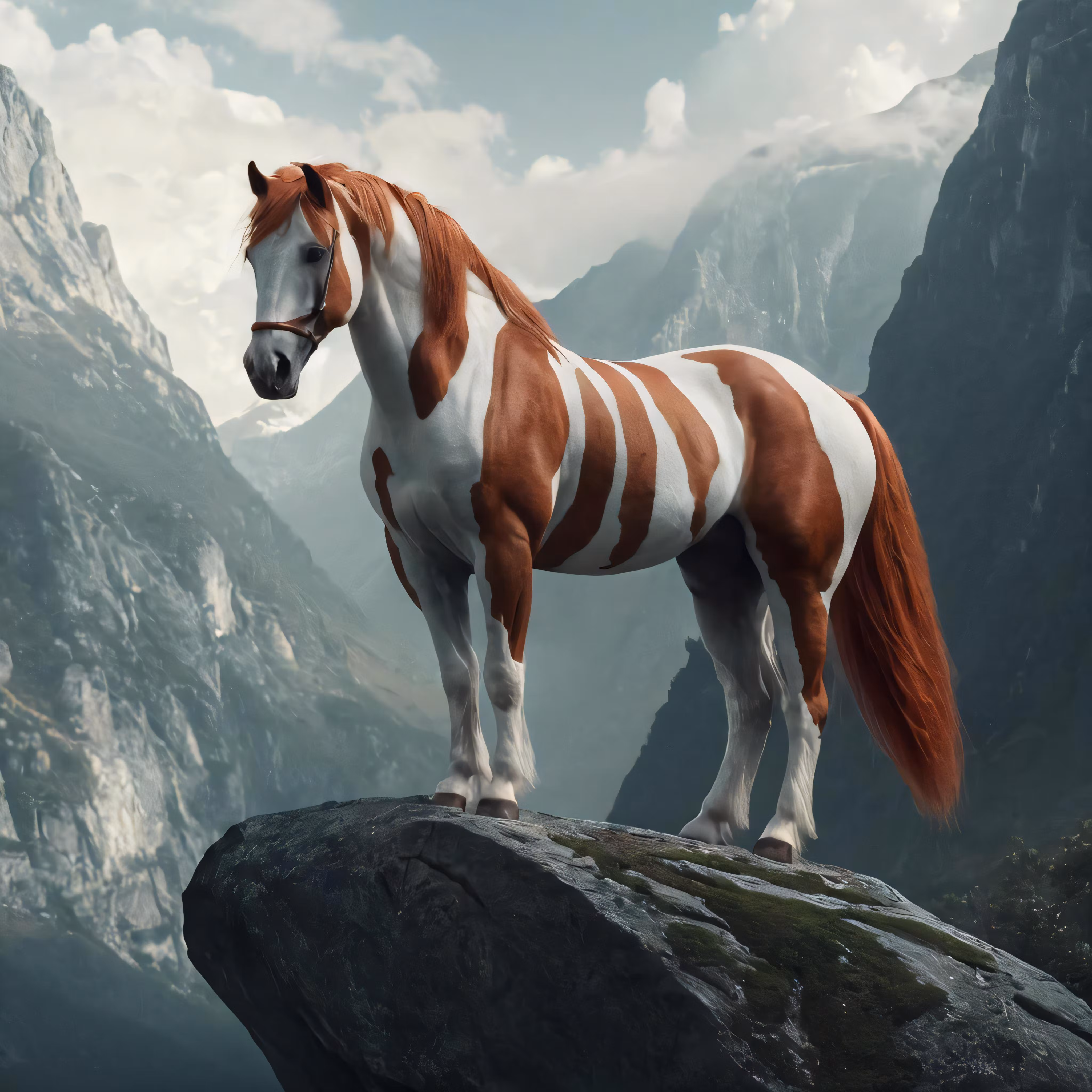 High resolution picture, free to use, a horse in costume standing on a rock, in front of a mountain range