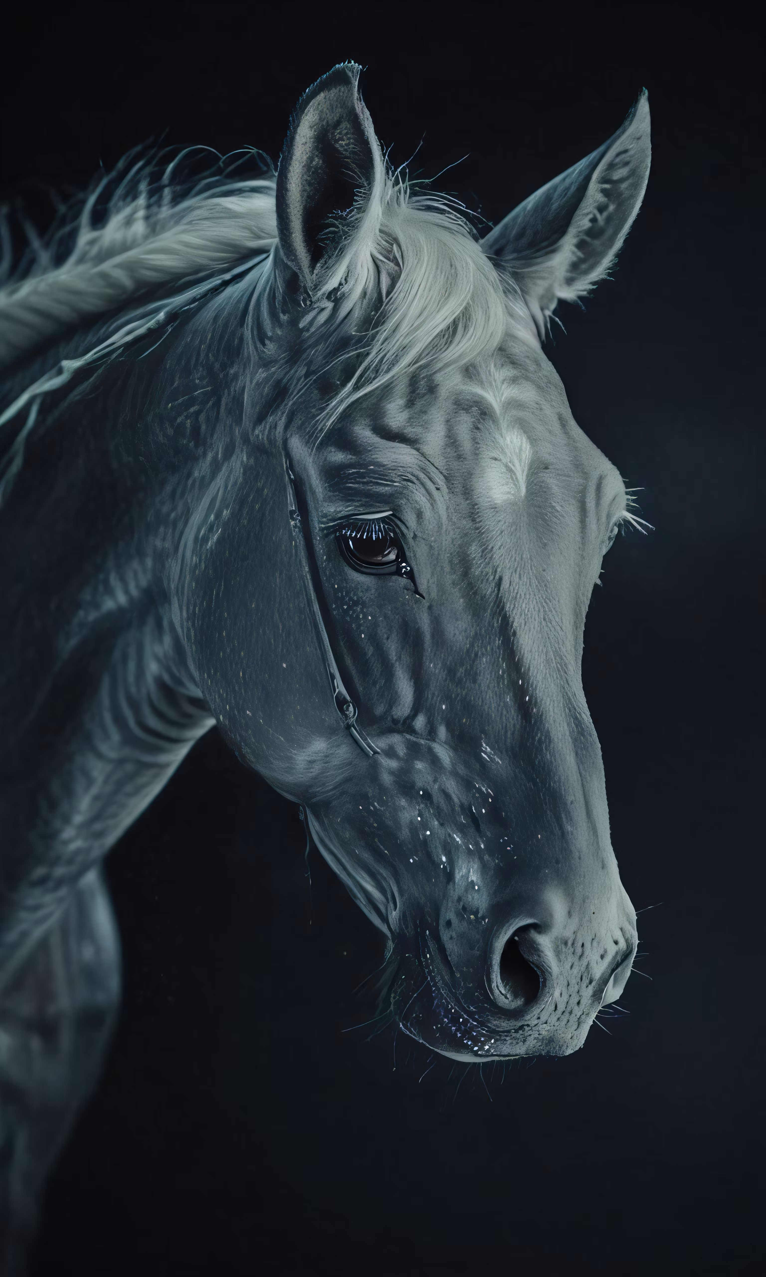 High resolution picture, free to use, a horse is shown in the dark with its head turned to look like a face