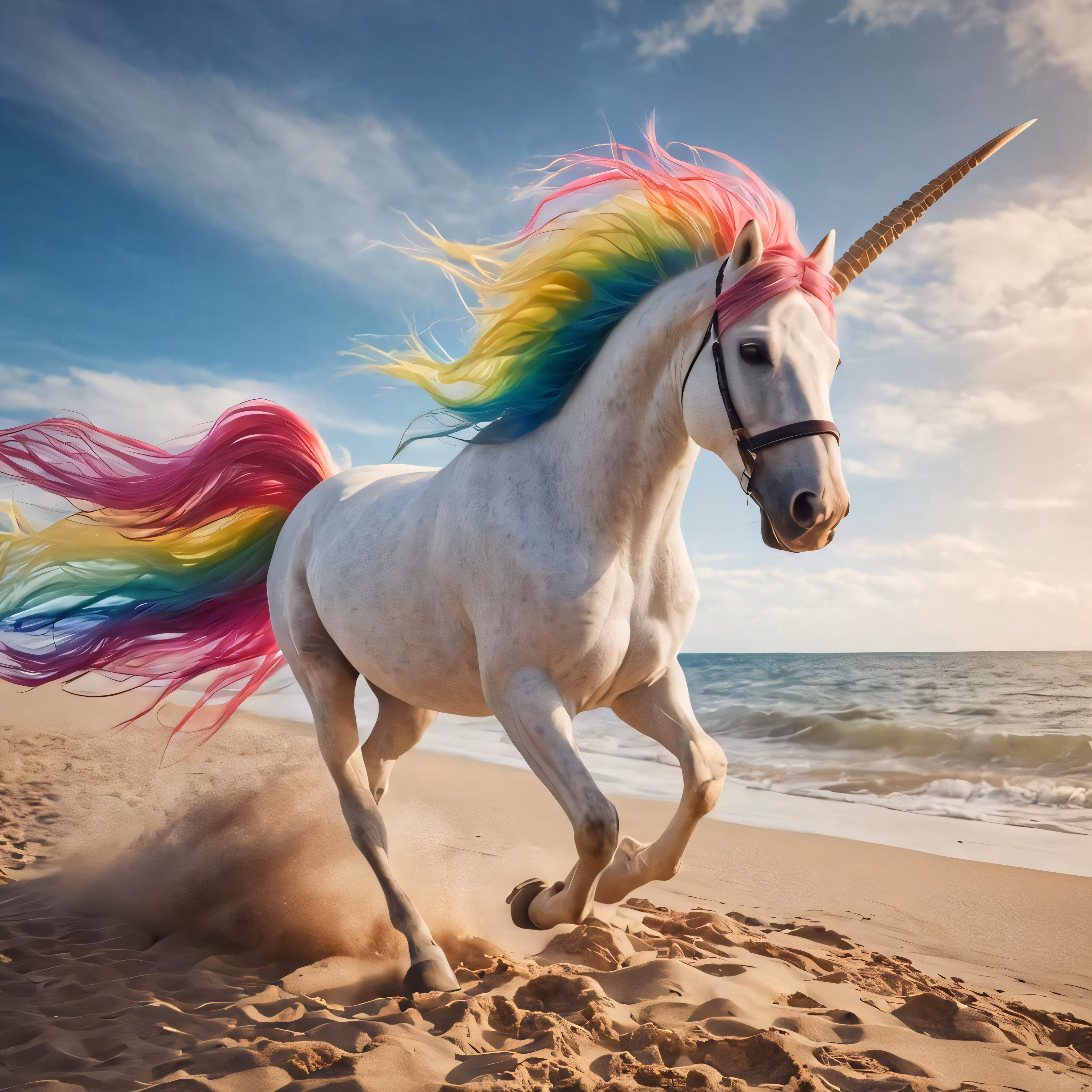 High resolution picture, free to use, a horse on the beach running along a sandy shoreline