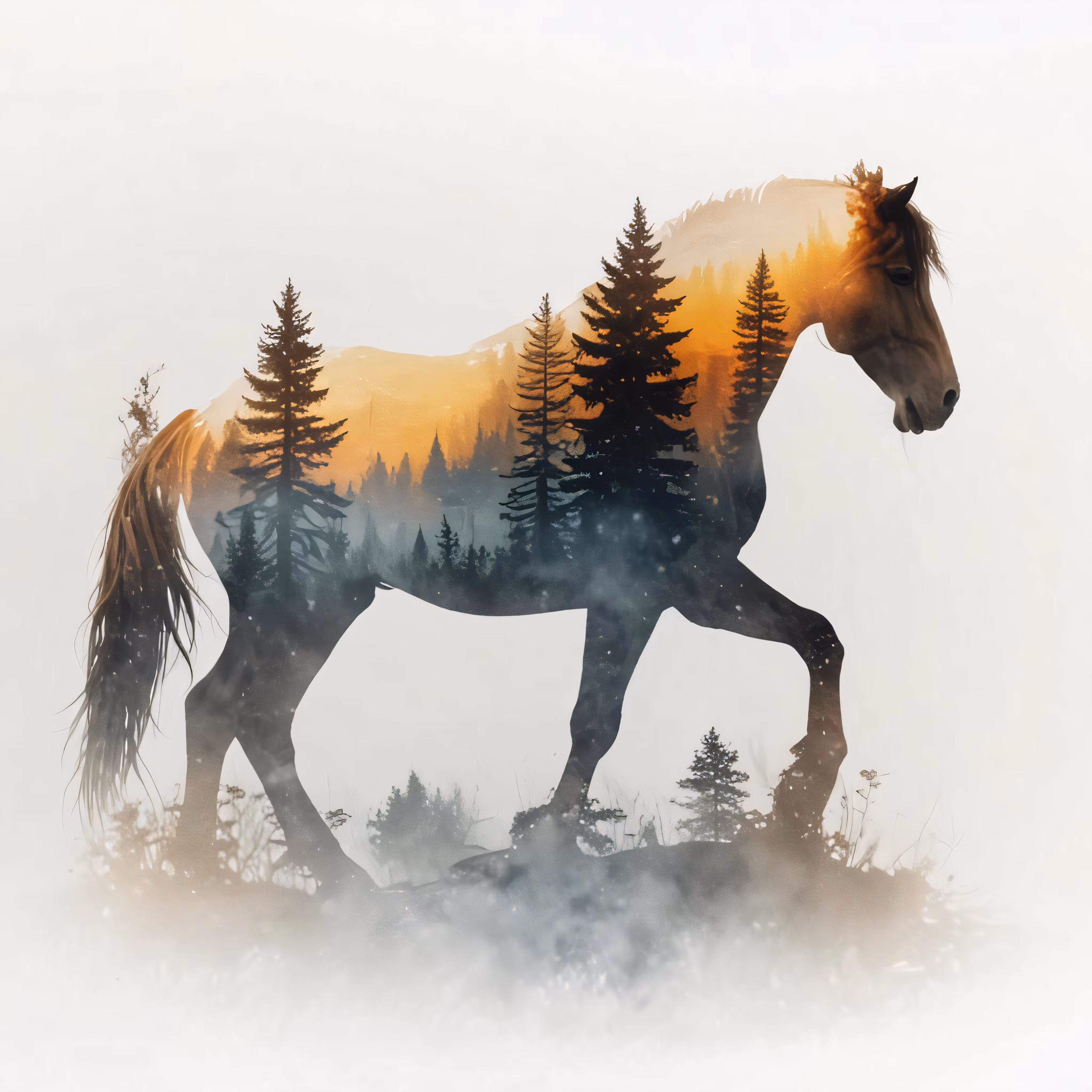High resolution picture, free to use, a horse with a long mane walking in the middle of a field