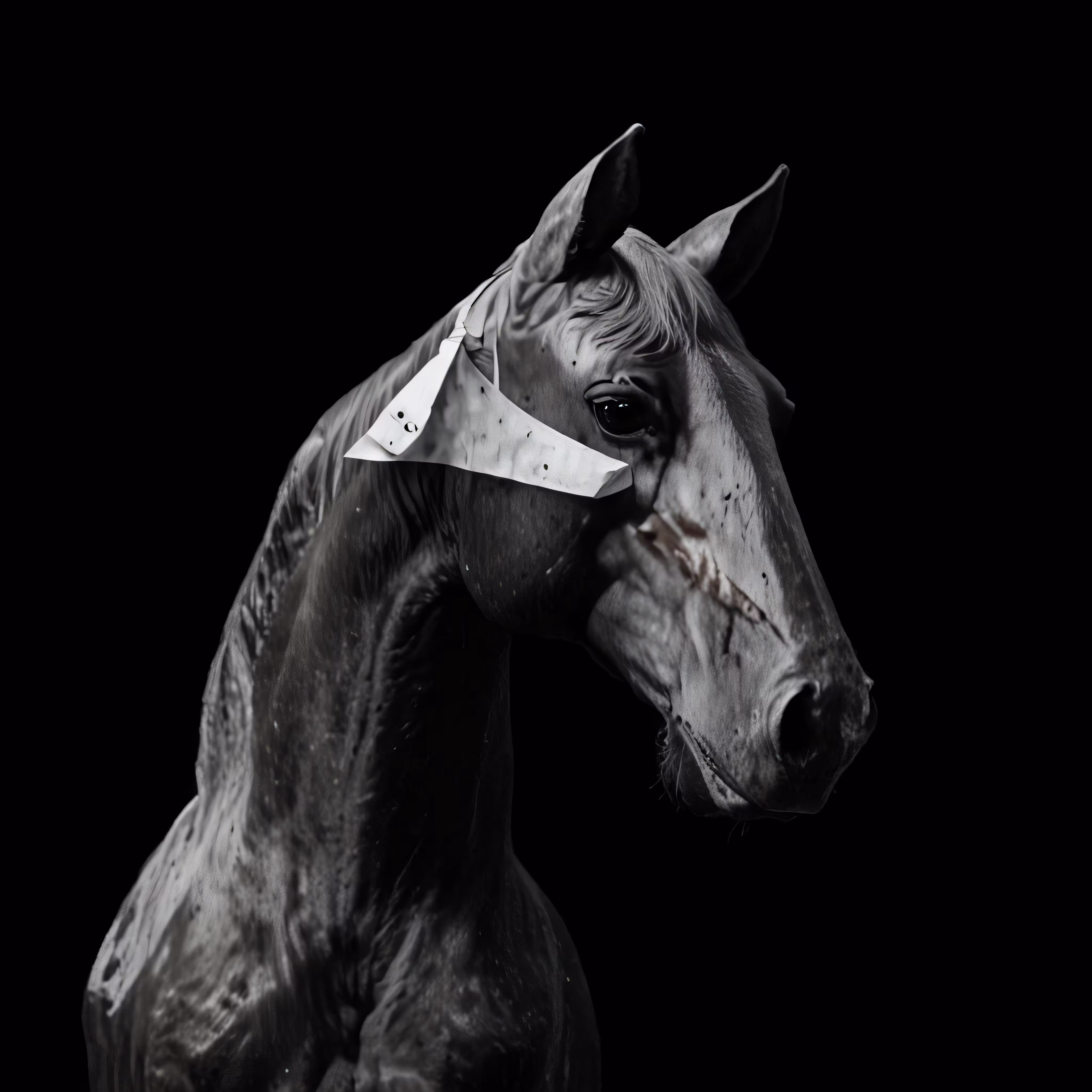 High resolution picture, free to use, a horse with an origami in its mane on black