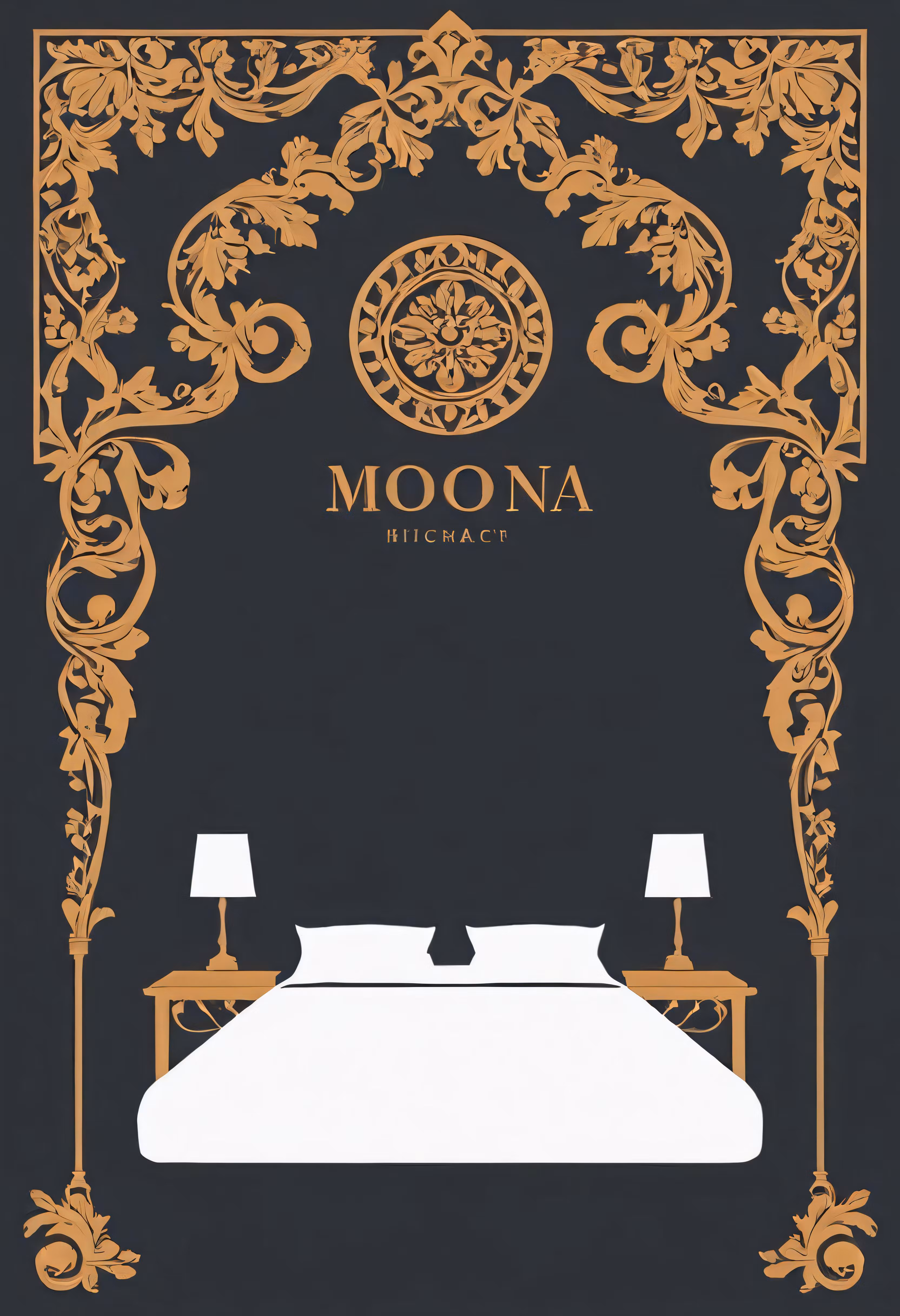 High resolution picture, free to use, a hotel room is depicted with a white and black poster