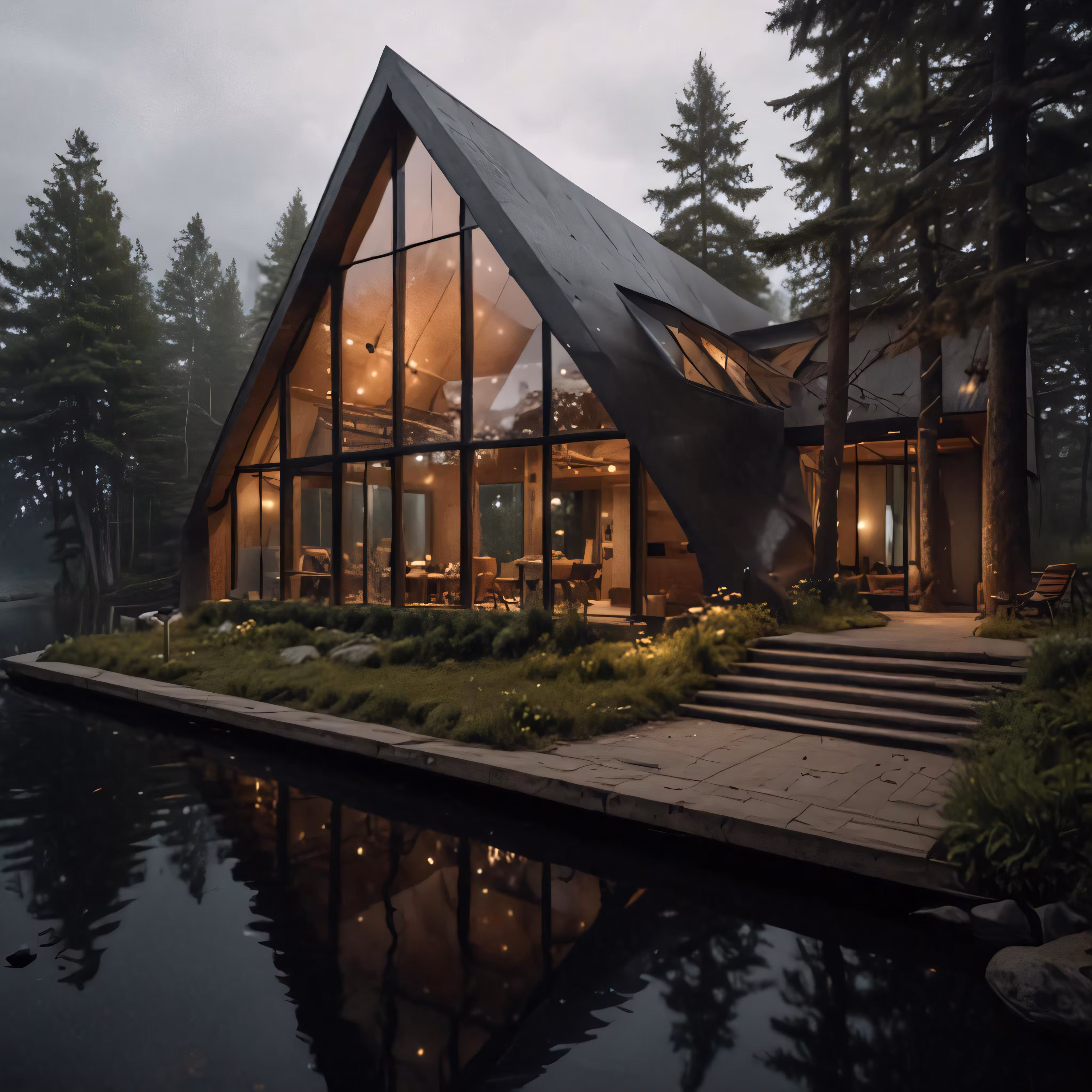 High resolution picture, free to use, a house sitting on top of a lake next to trees