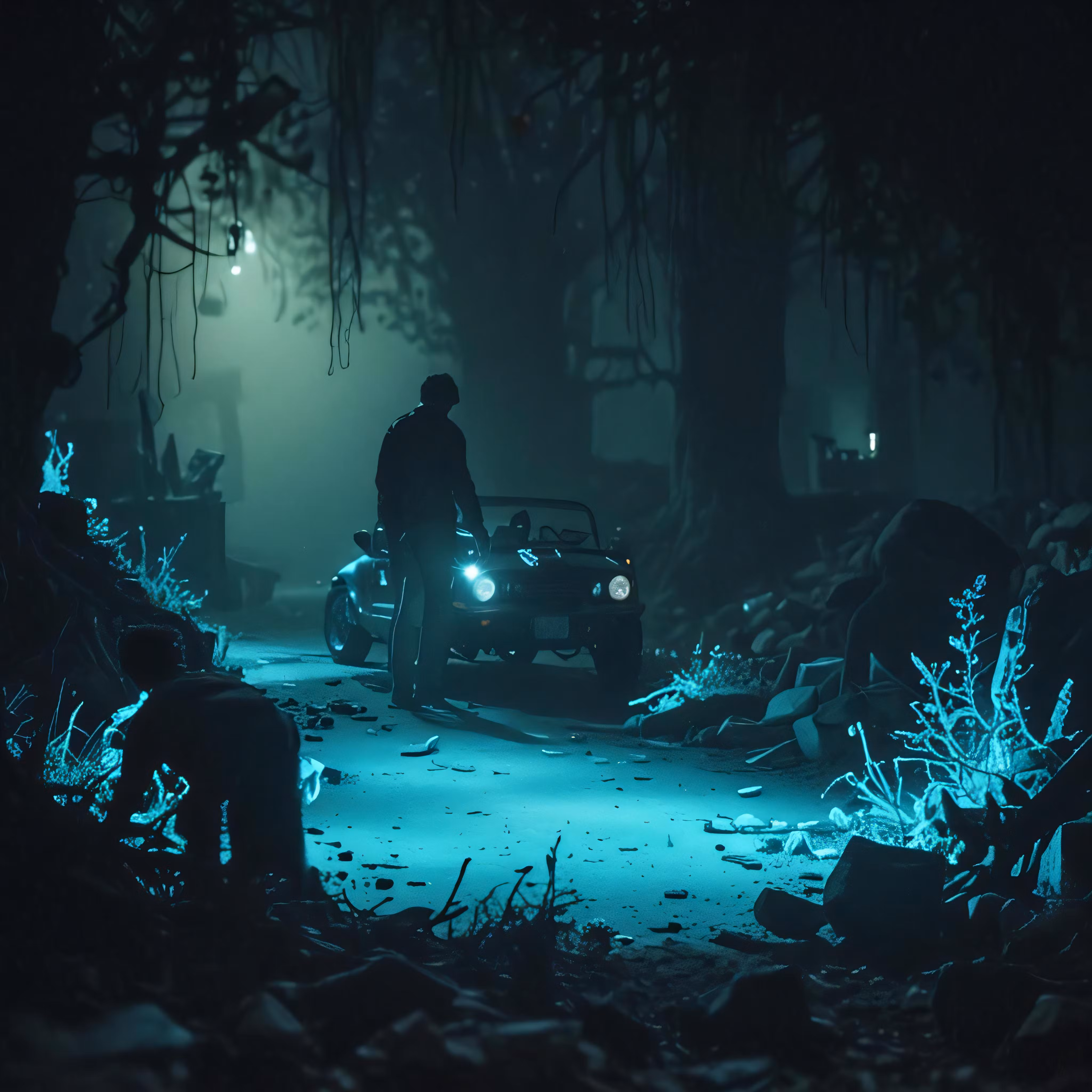High resolution picture, free to use, a jeep driver driving through the night in a dark forest