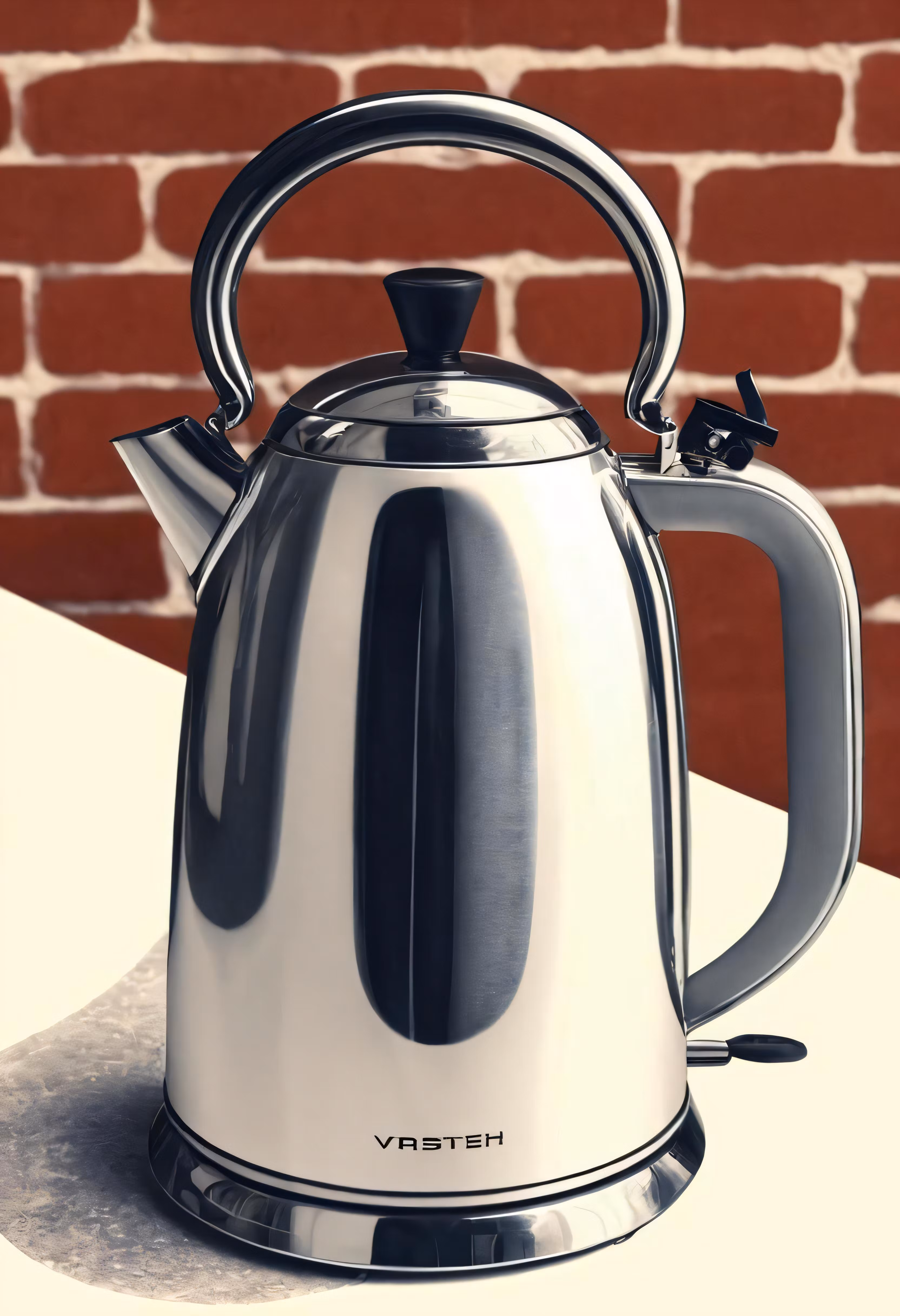 High resolution picture, free to use, a kettle sits on a table near a brick wall
