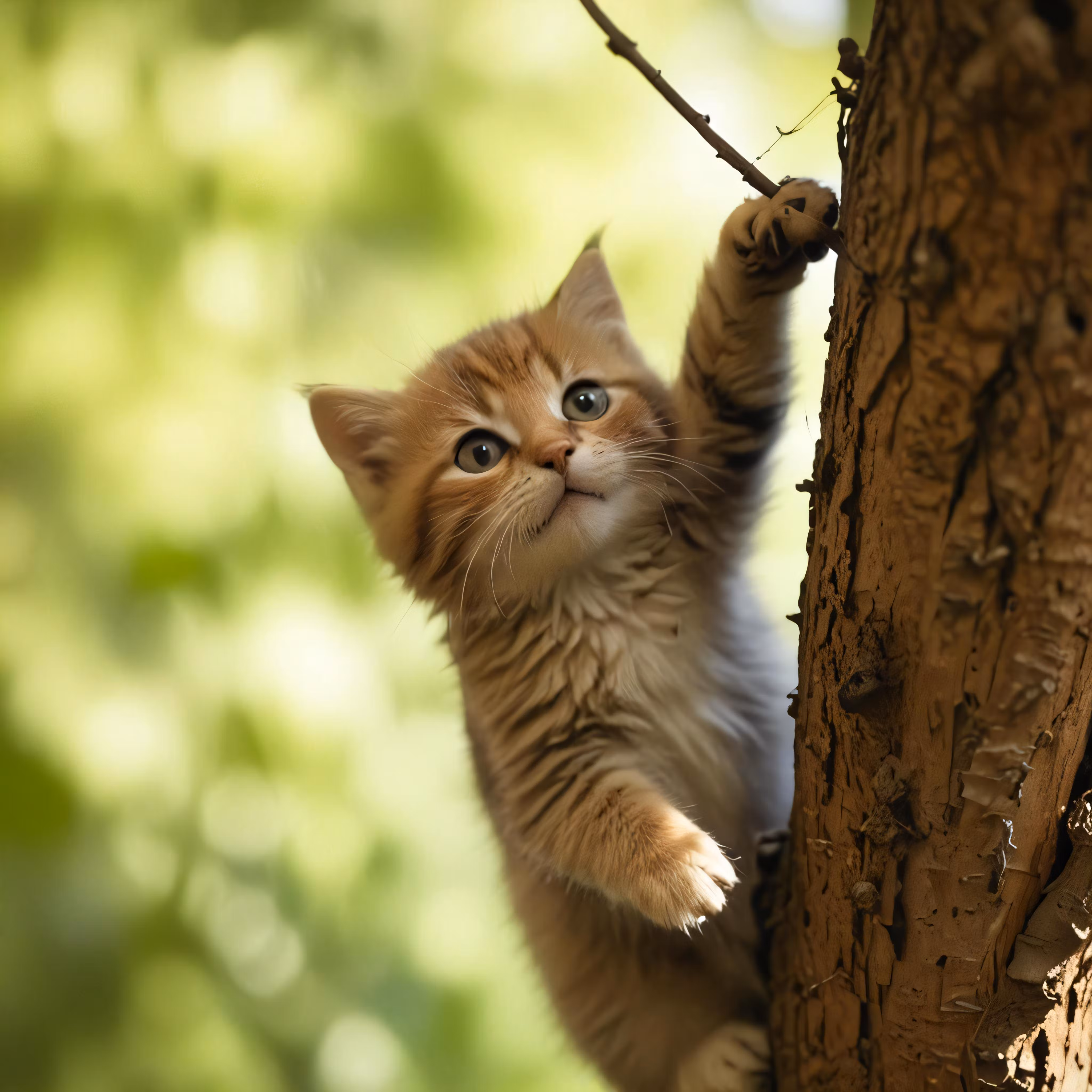 High resolution picture, free to use, a kitten climbing a tree and trying to get up