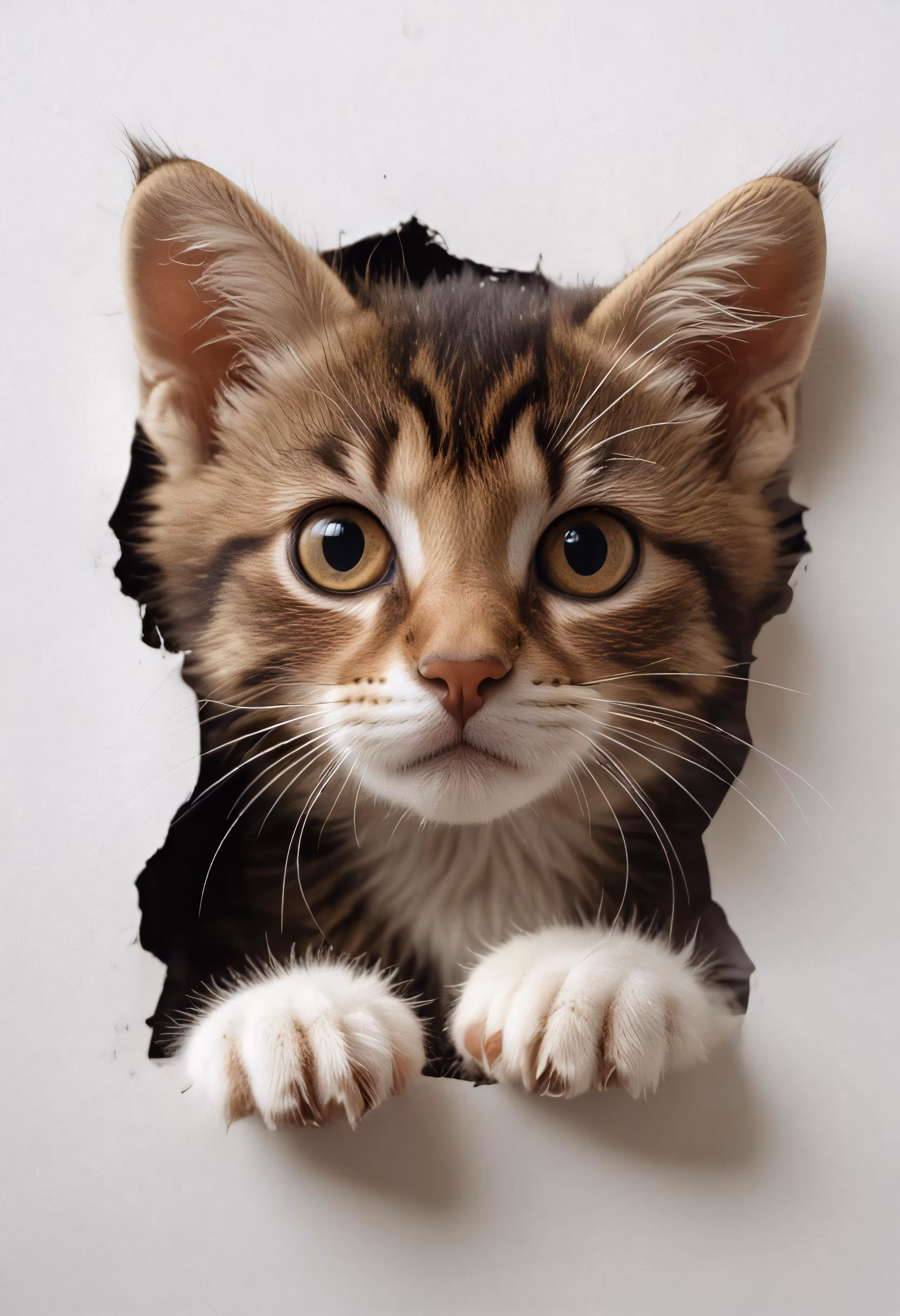 High resolution picture, free to use, a kitten peeks out of a torn piece of paper