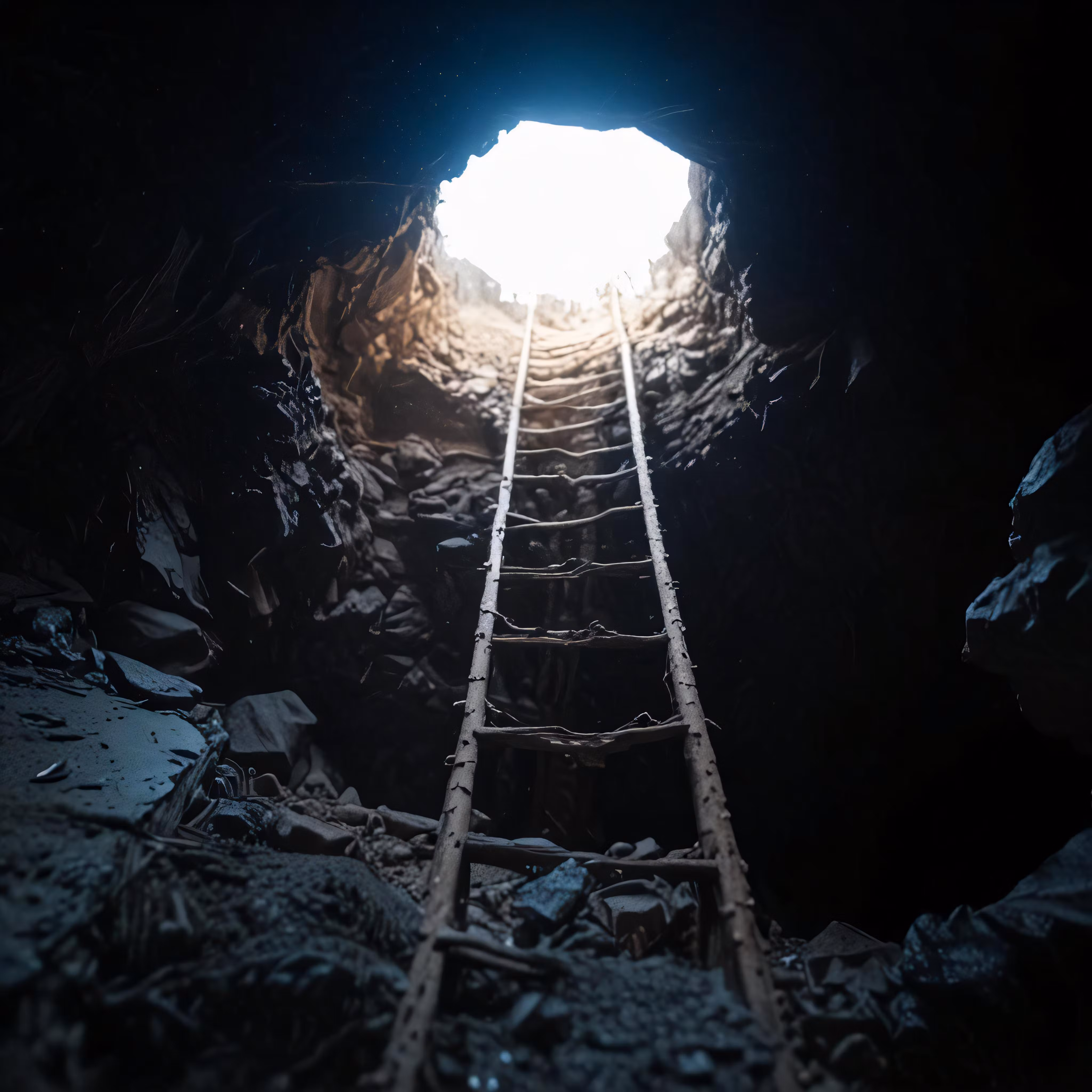 High resolution picture, free to use, a ladder leading into a tunnel with sunlight coming through