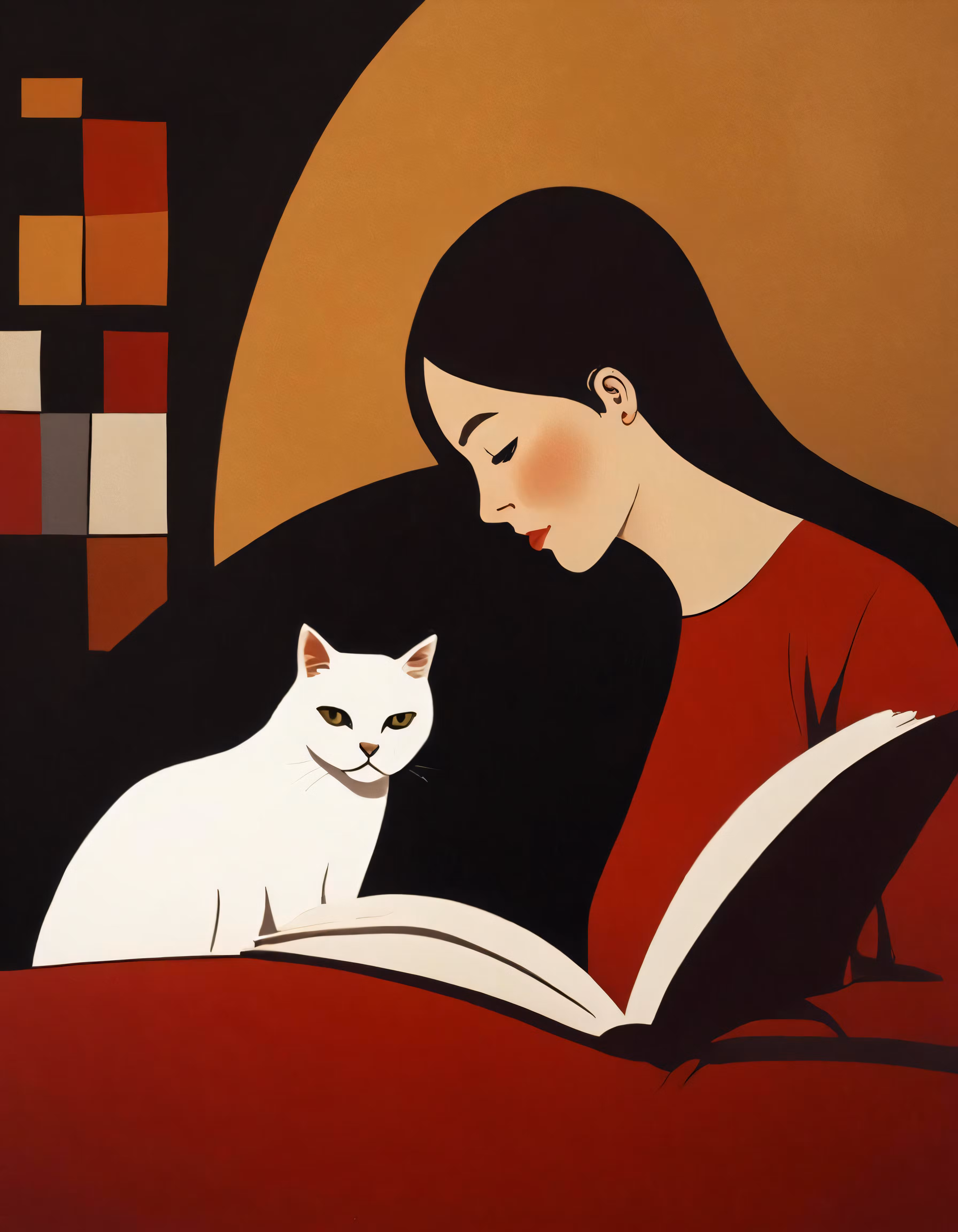 High resolution picture, free to use, a lady sitting in a chair next to a white cat