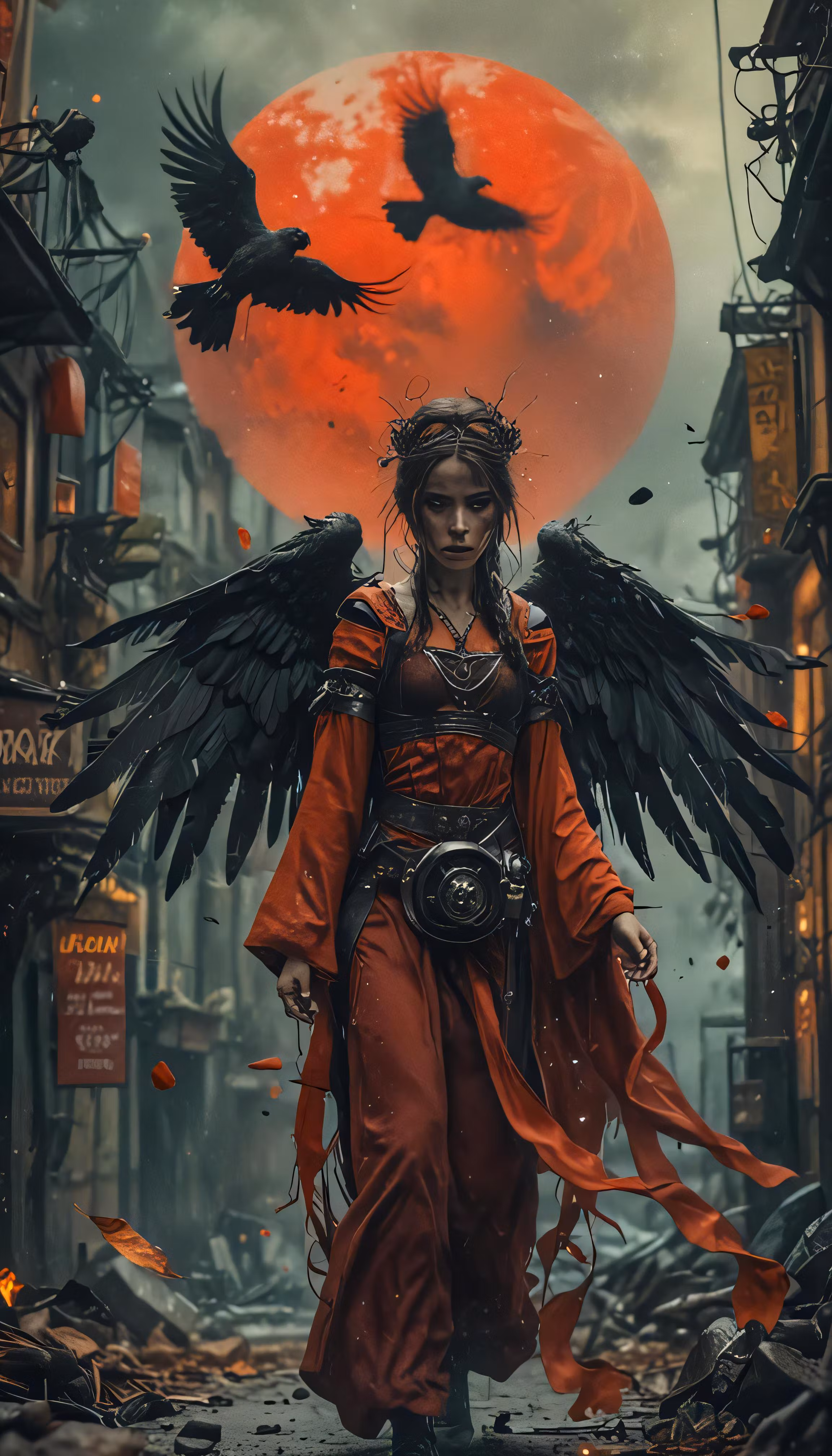 High resolution picture, free to use, a lady with dark hair and a winged halo and holding a large red umbrella in her hand